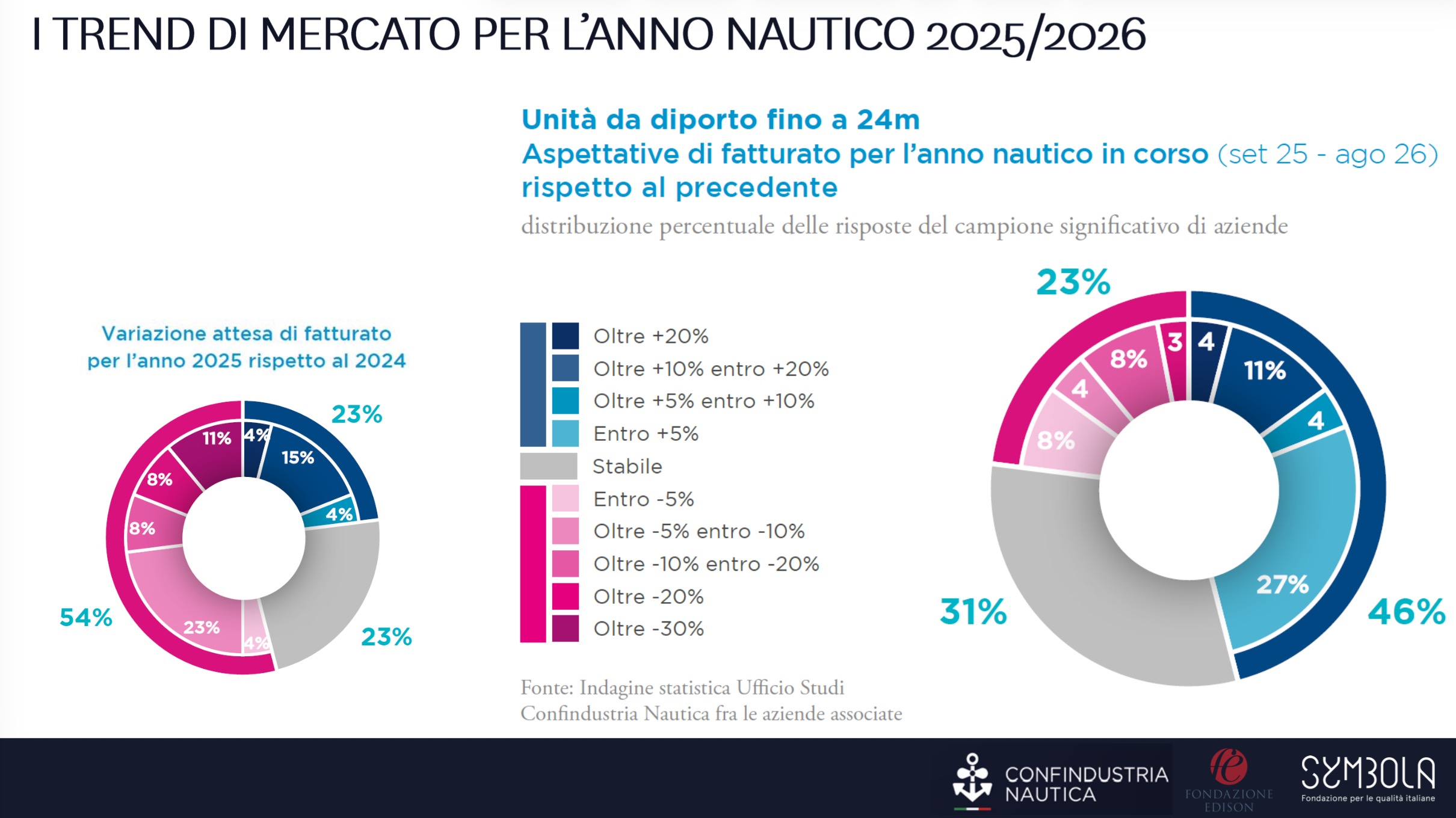 Per l’anno nautico 2025-2026 emergono tuttavia indicazioni più favorevoli: la quota di imprese che prevede un aumento del volume d’affari sale dal 23% al 46%, mentre la percentuale di aziende che ipotizza un calo del fatturato scende sotto il 25%.