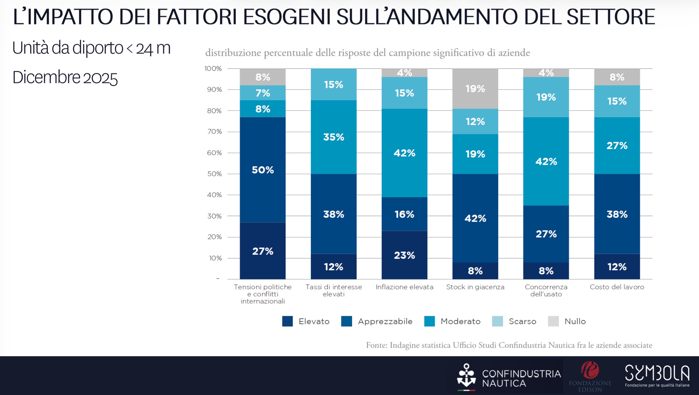 Accanto ai dati congiunturali, l’indagine ha analizzato anche i fattori esterni che influenzano l’andamento del settore. Tra i cantieri di produzione di unità fino a 24 metri, le tensioni politiche e i conflitti internazionali sono indicati come il fattore di maggiore impatto, segnalato come rilevante da oltre tre quarti del campione. Seguono l’elevato livello dei tassi di interesse, indicato come elemento critico da circa il 50% delle imprese, e il costo del lavoro.