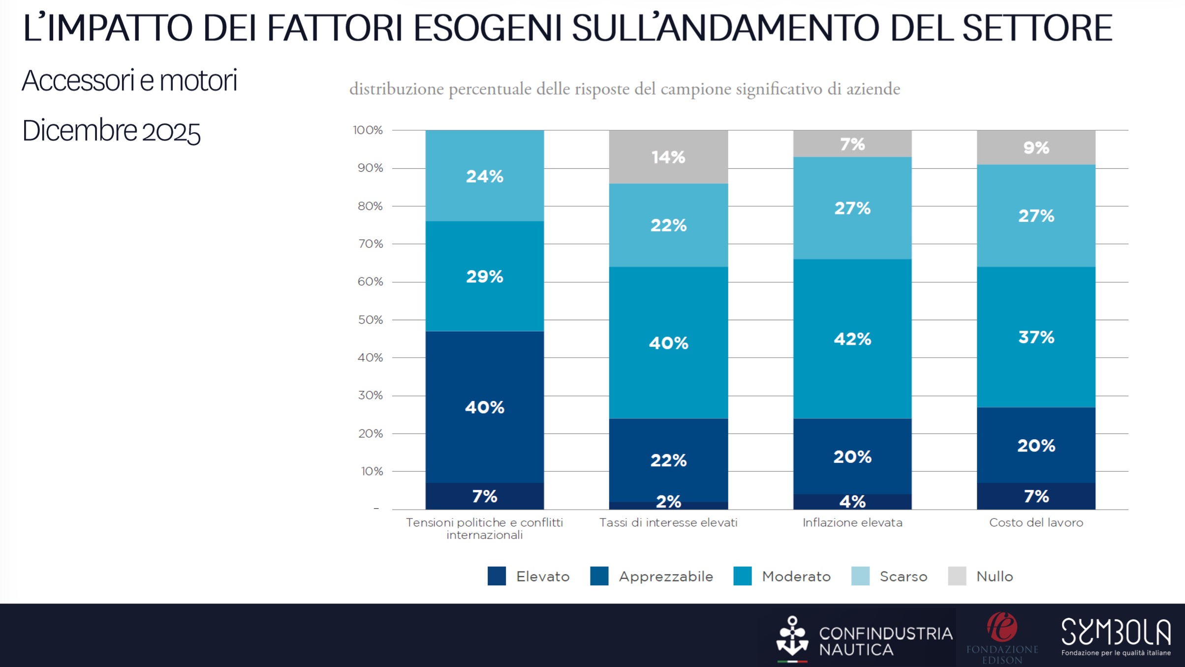 Tra le aziende di accessori e motori marini emerge una percezione analoga: anche in questo caso le tensioni geopolitiche risultano il fattore più significativo, con effetti sulla logistica internazionale e sulla disponibilità delle materie prime. Inflazione, tassi di interesse e costo del lavoro completano il quadro delle principali criticità segnalate dagli operatori.