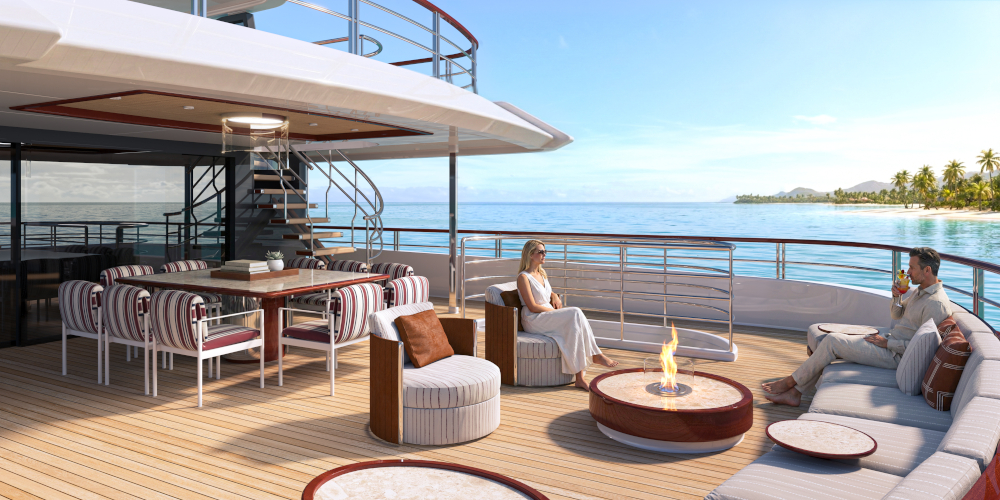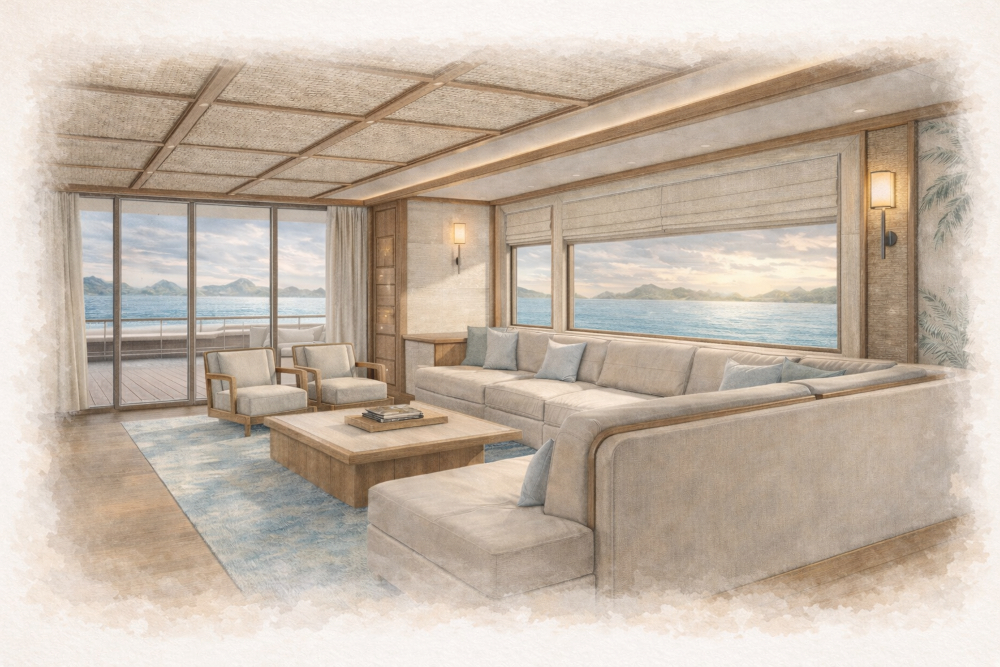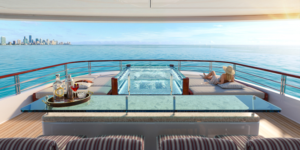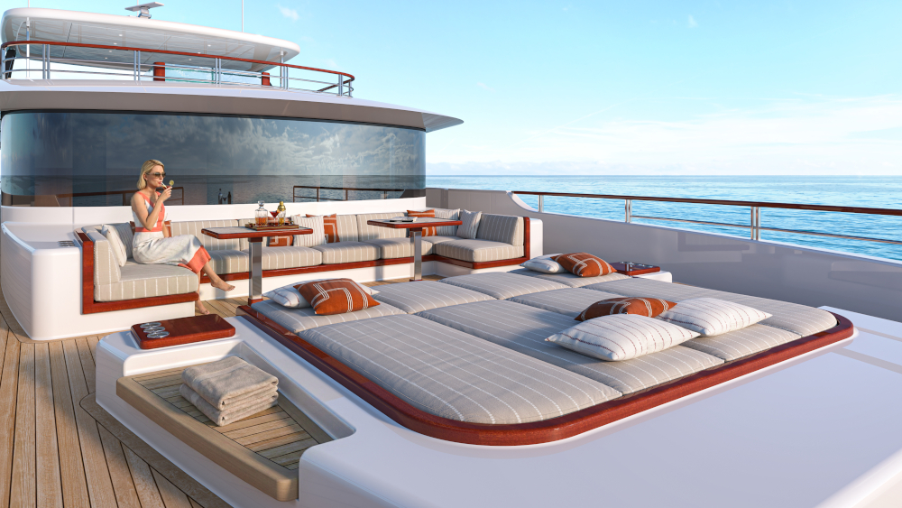 L’impostazione progettuale privilegia la continuità tra ambienti interni ed esterni, con una configurazione che richiama il concetto di “floating villa”. Gli spazi open air sono distribuiti su più livelli e includono un Sun Deck con Jacuzzi panoramica e area bar, oltre a un Bridge Deck attrezzato con zona lounge dotata di fire pit e area dining esterna. La presenza di più aree prendisole e zone relax consente una gestione flessibile degli spazi di bordo.