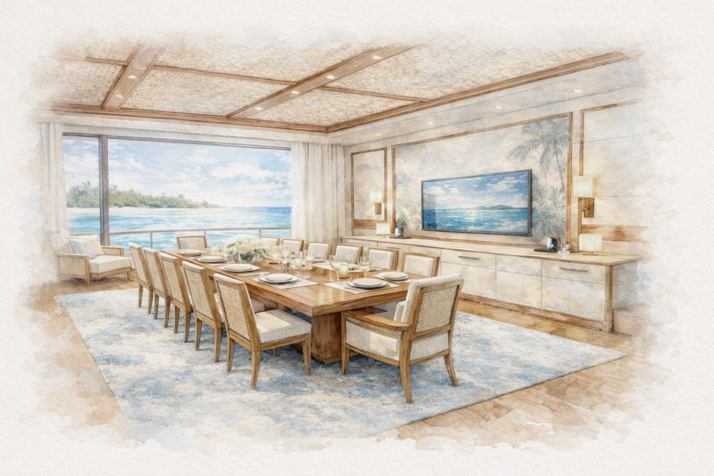 Gli interni sviluppano il tema del “barefoot luxury” attraverso l’impiego di materiali naturali e superfici tattili. Legni chiari, soffitti in rattan intrecciato e texture organiche definiscono un ambiente ispirato a atmosfere caraibiche, con un’impostazione orientata alla luce naturale e alla connessione visiva con il mare.