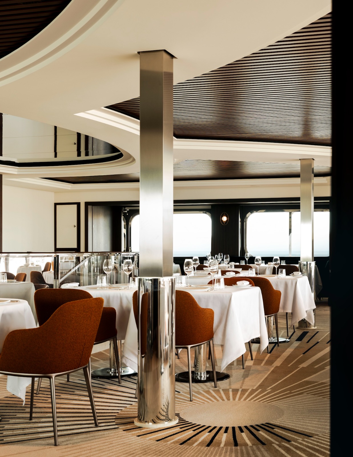 Gli interni, progettati sotto la direzione creativa di Maxime d’Angeac, reinterpretano in chiave contemporanea il linguaggio del mitico treno Orient Express, tra art déco e rimandi ai grandi transatlantici, utilizzando essenze lignee pregiate, marmi e pelli. L’offerta di bordo include cinque ristoranti e sale private, di cui il più esclusivo, con soli 20 coperti, si avvale della direzione culinaria dello chef pluristellato Yannick Alléno. E poi otto bar, un teatro cabaret da 115 posti e uno studio di registrazione completo, che permetterà a cantanti e musicisti di registrare ispirati dalla navigazione. Completano la dotazione una SPA Guerlain, una beach platform sul mare quando si è in rada e molti altri servizi ancillari proposti in formula all inclusive.
