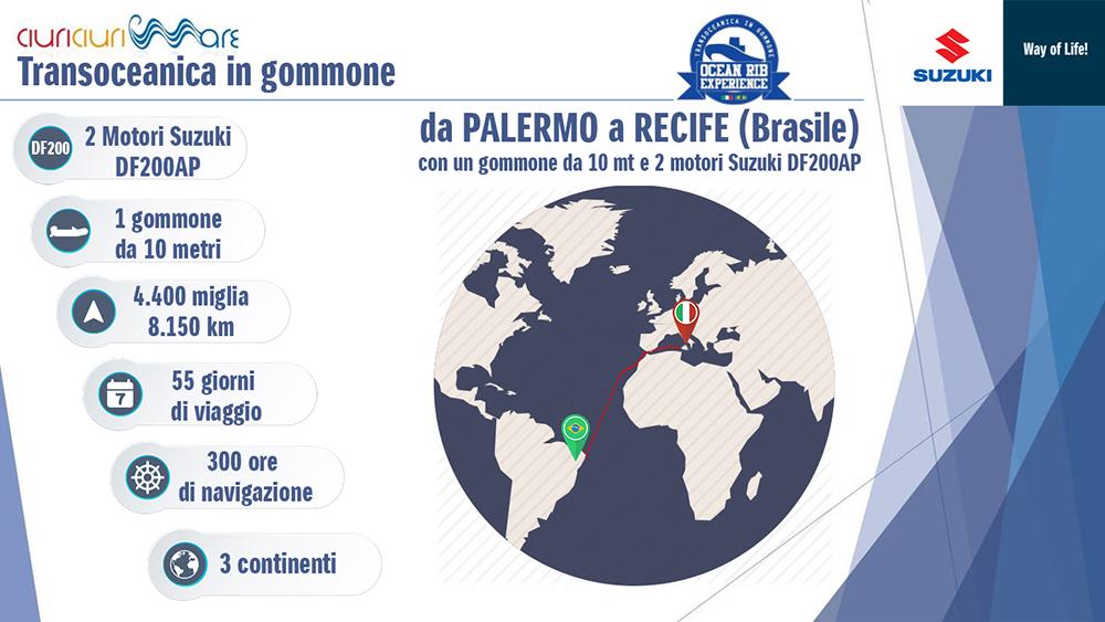 Avete presente quanti sono 8.150 chilometri? Tanti, tantissimi: corrispondono alle 4.400 miglia nautiche che separano Palermo da Recife, in Brasile. E a chi verrebbe in mente di affrontare una navigazione tanto lunga con una barca a motore, anzi per l’esattezza con un gommone di appena 10 metri? Solo a chi è “abituato” a fare imprese di un certo tipo, che lasciano in molti stupiti, ma che fanno sognare tanti appassionati.