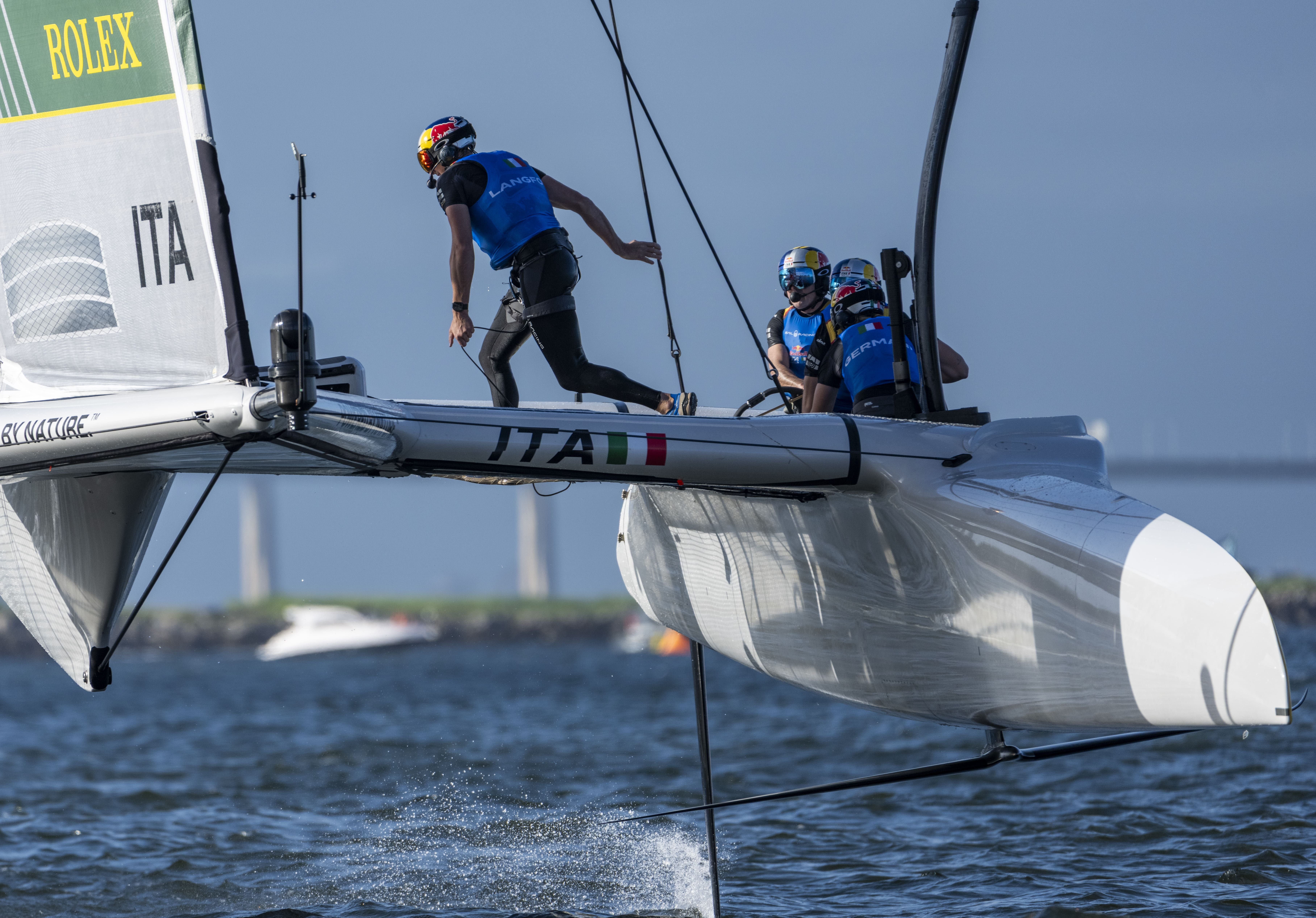 La giornata di domenica ha accolto i dodici team con cielo coperto e vento leggero, portando all’adozione della configurazione con wing da 27.5 metri e timoni ad alta velocità: una soluzione estremamente tecnica ma particolarmente efficace in questo contesto, con cinque persone a bordo rispetto alle quattro del giorno precedente.