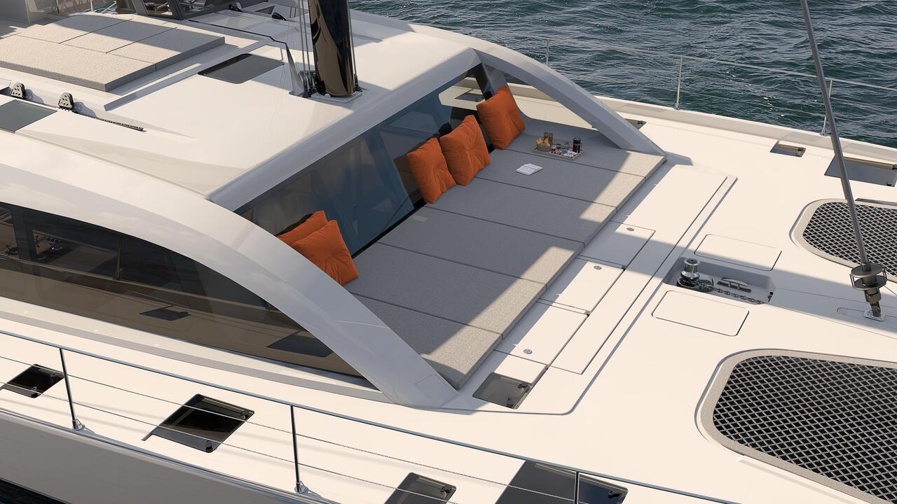 Mit dem vorderen Cockpit entfällt auch die verbindende Tür zum Salon, wodurch mehr Komfort und weiterer Wohnraum im Salon geschaffen wird. Zudem entsteht eine durchgehende Verglasung vor dem Navigationstisch, die eine bessere Sicht ermöglicht und dem Katamaran ein noch dynamischeres Aussehen verleiht.