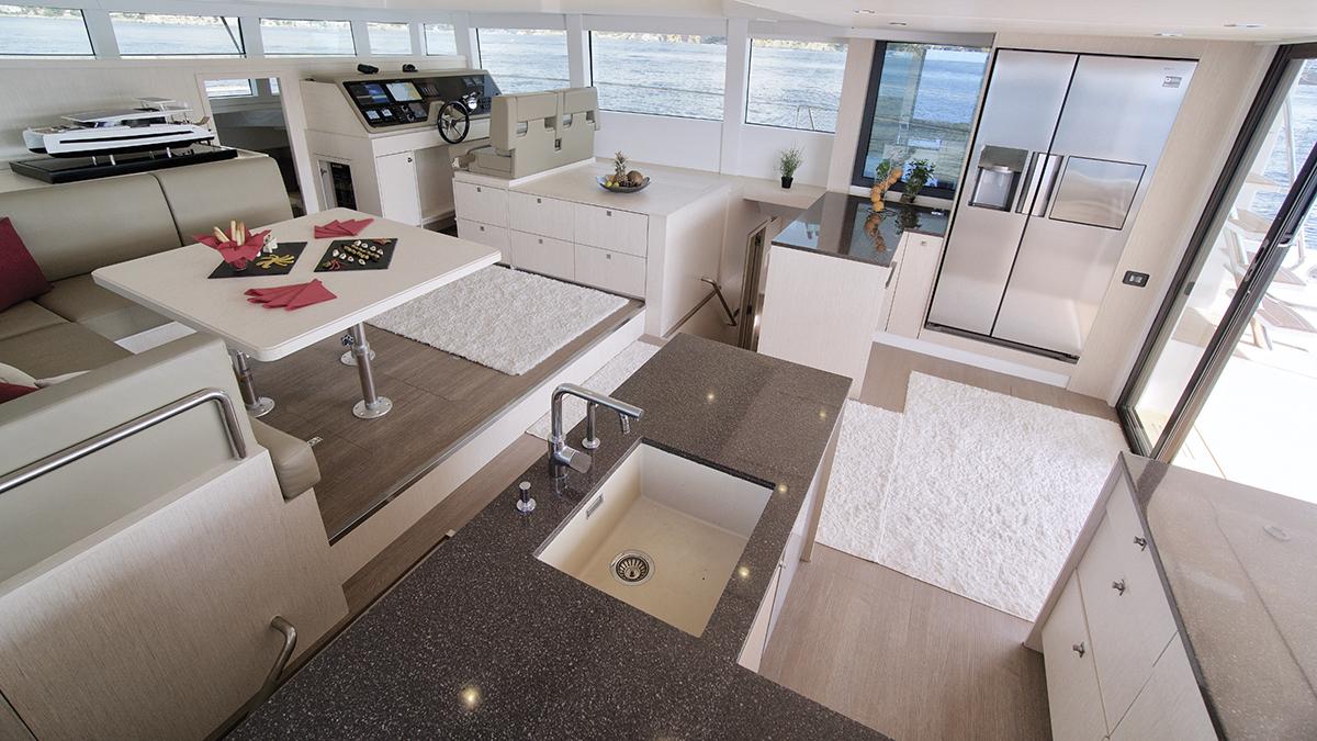 Lassen wir kurz nüchterne Leistungs-daten links liegen und schauen uns das schwimmende Solarkraftwerk als mobiles Feriendomizil an. Das Katamaran-Konzept bietet nicht nur schön viel Solarzellen-Fläche, sondern eröffnet auch viel Raum für das Einrichungs- und Wohnkonzept. Hell und luftig präsentiert sich die Silen 55 nicht nur im Open Space von Salon, Küche und Innensteuerstand. Viel Licht und grosszügige Stehhöhe herrschen auch in den Kabinen und Badezimmern. Die Eignerkabine bekäme in einem Hotel das Prädikat „Suite mit Meerblick“. Das Schlafzimmer nützt die komplette Schiffsbreite aus, mit dem umlaufenden Fensterstreifen im Deckhaus-Stil und den tieferliegenden Frontfenstern entsteht ein faszinierendes Raumgefühl mit Blick auf Wind, Wellen und Weite. So gar nichts von den typisch schiffigen „Nasszellen“ haben die Bäder vorzuweisen. Im Gegenteil, die Ausstattung ist wie man es an Land gewöhnt ist: richtige Keramik-WCs, verglaste Duschkabinen und extravante Lavabos kultivieren das Badezimmer-Feeling. Etwas kleiner dimensioniert, aber mit dem gleichen komfortablen Luxus und dank grossen Fenstern ebenso lichtdurchflutet, brauchen sich die Kabinen in den Rümpfen nicht zu verstecken. So können acht Personen in vier Doppelkabinen premiummässig untergebracht werden. Wenn es ein Badetripp zu nächsten Bucht sein soll, dürfen maximal 20 Personen an Bord gehen. Bei einer Atlantiküberquerung dürfen es 12 sein, so könnte sich eine achtköpfige Reise- oder Chartergruppe von vier Crewmitgliedern verwöhnen lassen, deren Unterkünfte im Kopfteil der Rümpfe liegen. Die Drinks können sich die Gäste wahlweise auf die Flybridge, auf die Liegeflächen im Vorschiff oder auf die Sonnenliegen des Dinghyträgers servieren lassen. Oder doch lieber im Innen- oder Aussensalon? Auch seitlich des Deckhauses sind noch Sitznischen eingelassen – Rückzugsorte gibt es also genug. Und wenn ich es mir so richtig überlege, braucht es auch keine Crew. Zu tun gibt es nicht viel und das „Arbeiten“ in der profimässig eingerichteten Profiküche wird selbst zum reinen Vergnügen. Und die Drinks im doppeltürigen Kühl-„Schrank“ werde ich doch noch wohl selbst finden…