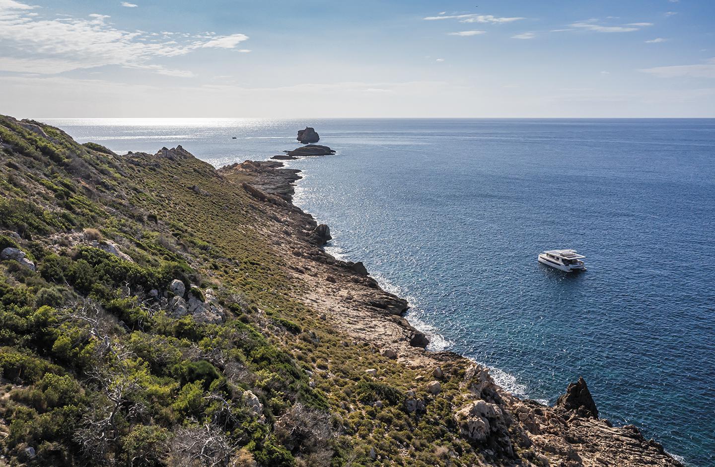 Aber auch ohne Wind geht es vorwärts. Wenn die Sonne scheint, ist die Reichweite unbegrenzt. Und legt man keinen Wert auf rasende Geschwindigkeiten, kann man Tag und Nacht durchfahren. Energie ist genug da, den drei Batteriebänken mit 210kWh Kapazität gehört unser Dank. Ich schaue dem Kapiän über die Schulter. Gesteuert wird mit einem kleinen Simrad-Hebelchen – oder dann mit Autopilot. Das klassische Steuerrad ist nur für den Notfall da, sollte das elektrische System einmal gänzlich aussteigen. Nachdem der obligate Speedtest abgehakt ist (die Silent 60 schafft 13 Knoten) ziehen wir – wie die meisten Silent-Kunden – Entschleunigung und Ruhe vor. Am Steuerstand sehen wir das Resultat unserer weisen Entscheidung auf den Displays in Echtzeit: Reduzieren wir den Speed von 9.8 auf angenehme 5.5 Knoten, brauchen wir sechsmal weniger Power für die E-Motoren (7 anstatt 42 kW). Wir cruisen entspannt der Küste entlang, passieren die Malgrats-Felsformationen und nehmen Kurs auf die Bucht von Santa Ponsa. Als wir vor Anker liegen, tippt der Captain auf dem Display auf “Ankermodus”, ab jetzt geht sämtliche Energie automatisch in die Hotelfunktionen wie Klimaanlage, Kühlschrank oder Espressomaschine. Selbst für diese Stromfresser liefern die Panels genug Energie. Und sollte es wirklich einmal tagelang schneien – dann sorgt ein Volvo-Generator für Abhilfe