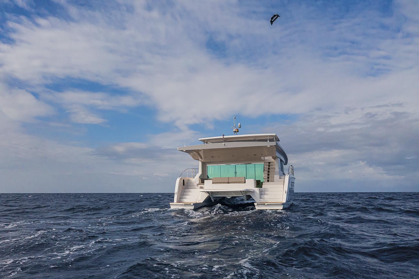 Die Welt entdecken, auf nachhaltige Art und Weise. Und mit dem Komfort, wie man ihn an Land gewöhnt ist. Die schwimmende Villa bietet eine überdachte Lounge auf dem Achterdeck. Die äussere Sofalehne lässt sich umklappen, so kann man nach innen oder ins Weite blicken. Die Plattform lässt sich bis unter das Wasser absenken und erleichtert so das Tenderhandling ungemein.
