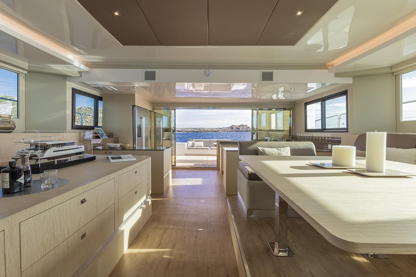Wer noch ihren Prototypen Solarwave 46 vor dem geistigen Auge hat, dem wird beim Anblick der neuen Silent 60 erst richtig klar, was für ein Quantensprung hier stattgefunden hat. Vom Test- und Labor-Katamaran zu einer ausgereiften HighEnd-Yacht – nicht nur technisch auf der Höhe, sondern dank Designer Marco Casali auch in einem überzeugenden und selbstbewussten Look. Durch ihre Breite bieten Kamarane innen und aussen ja schon jede Menge Platz – doch die Silent 60 punktet auch mit mehr Raumgefühl in der Höhe. Im Salon kann ich die Hände nach oben austrecken, an die Decke komme ich trotzdem noch lange nicht. Der Salon, die Pantry, die Kabinen, die Nasszellen – überall grosszügige Dimensionen und gepflegtes Ambiente. Selbst der futuristische Steuerstand passt ins gestylte Ganze. Kein Wunder erhielt die Silent 60 den German Design Award in der Kategorie Excellent Product Design.