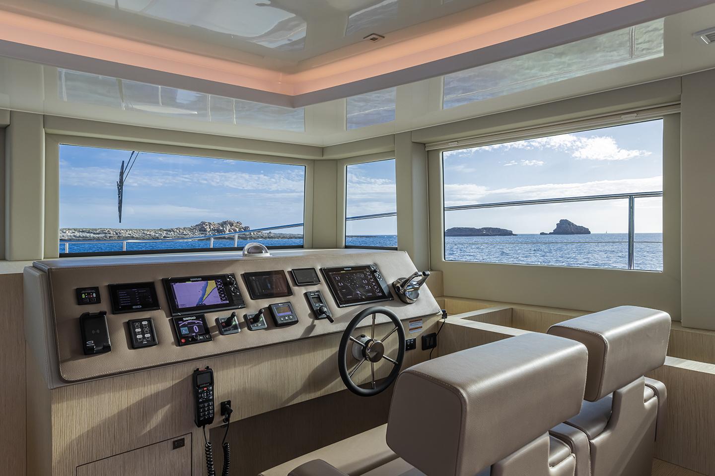 Für den Skipper gibt es auf der Backbordseite eine eigene Kabine ebenfalls mit Bad – Zugang via Lukeneinstieg von aussen. Gefallen haben uns auch die seitlichen, alkovenartigen Rückzugsorte an Deck. Nicht zu vergessen die grosszügige Lounge auf der Fly Bridge (oder ist es schon ein Fly Deck?) – auf dieser Yacht findet jeder ein Lieblingsplätzchen.