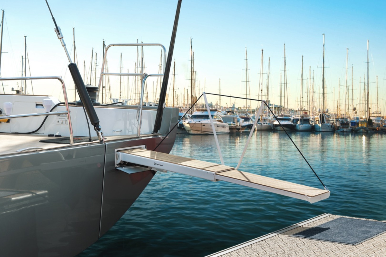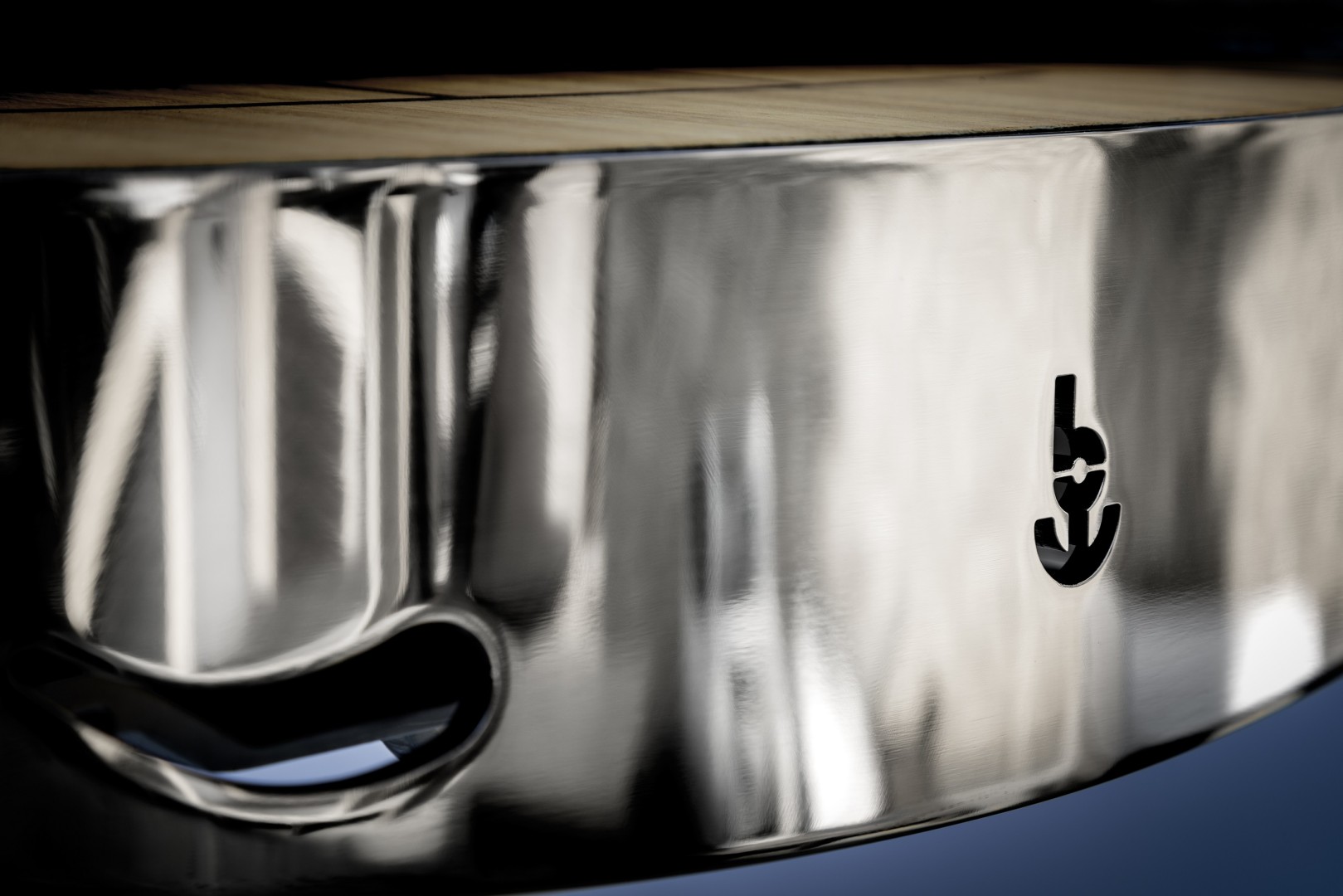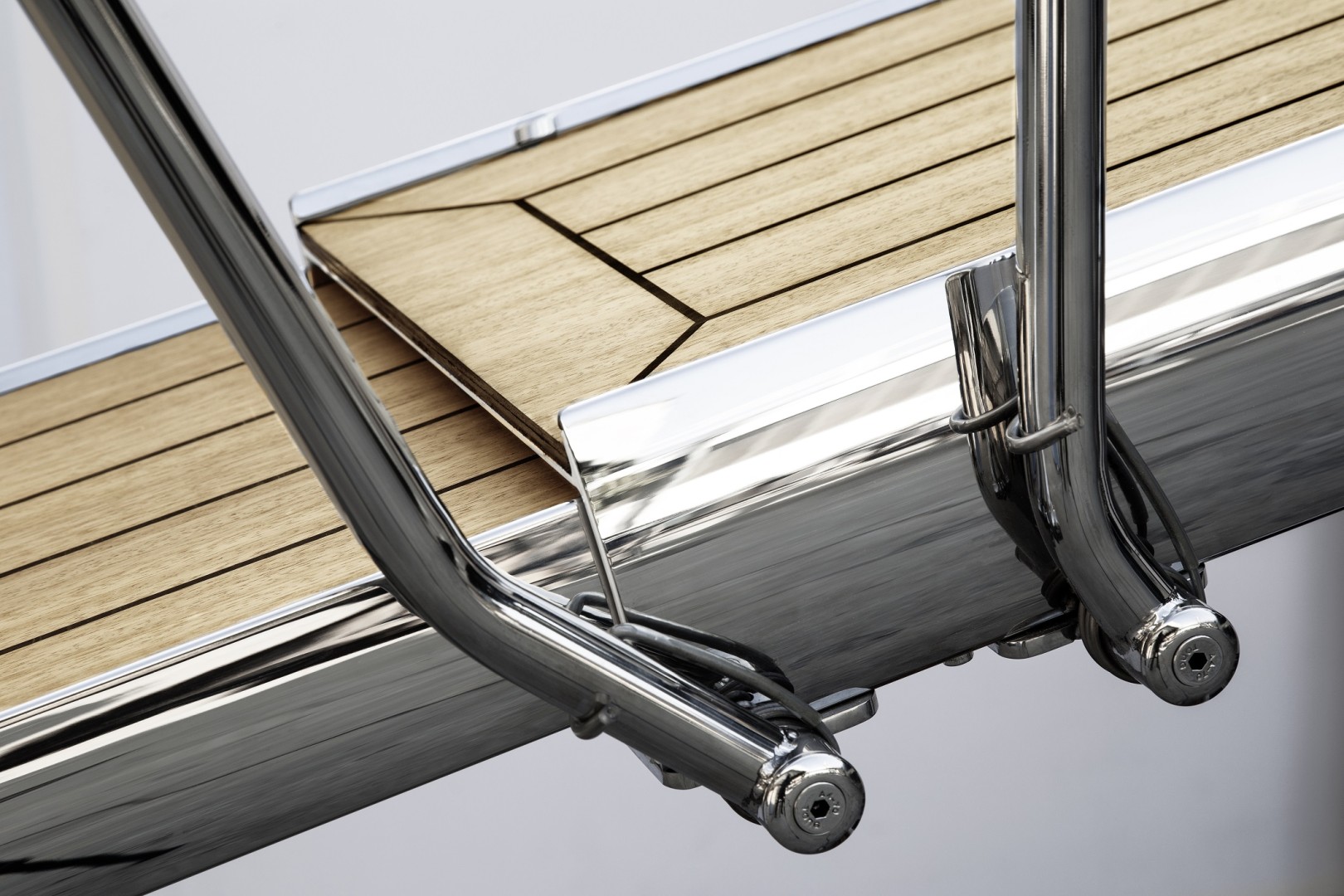 As regards the more classic hydraulic accessories produced by the Sarnico-based company, at the show you will find the PI461 Miss, Miss by name and Miss by nature: it is indeed the most highly regarded external hydraulic gangway that we produce and is sought after on account of its lightness and performance. It is operated hydraulically by using a remote control or wall-mounted control panel which makes it easy to lift/lower the tender from/into the water. The lifting capacity varies depending on the model and can go up to 200 kg depending on the tender crane and water toys. It is made of painted aluminium but we also have a version available with a polished housing. The step plate is made of 100% eco-friendly, synthetic, UV-stabilised material together with the automatic handrail rope ensure maximum safety.