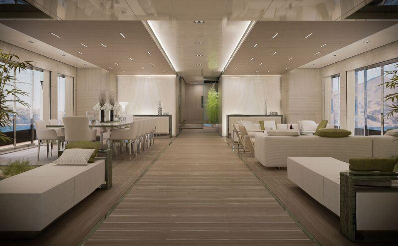 The yacht comprises five decks, the total length is 68m, while the beam is 13m. The internal volume is very impressive, at more than 1,800 GRT.