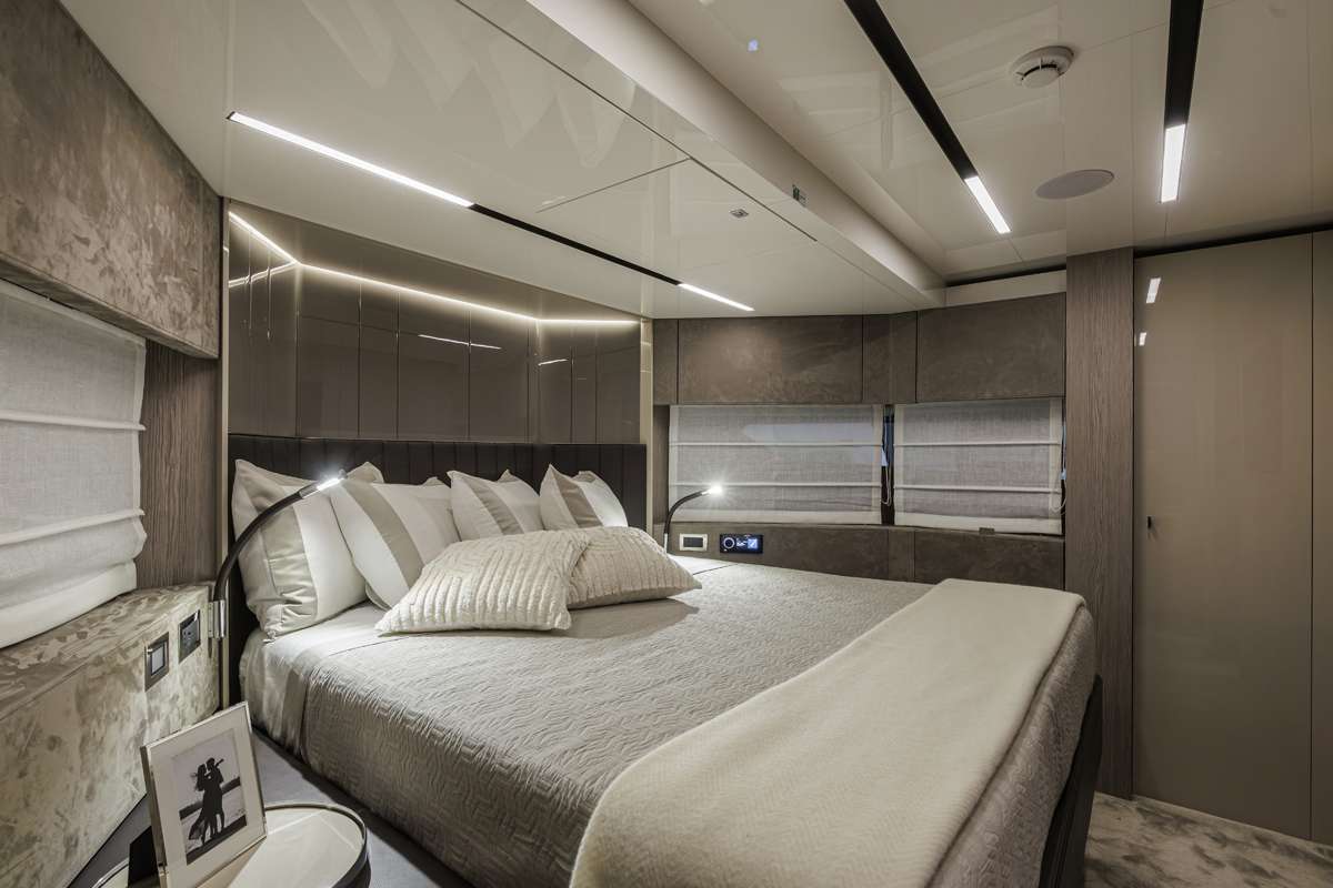 On the lower deck, the full-beam master suite is a masterpiece of space and design, featuring a wall-mounted bathroom with smoked glass that enhances the sense of openness. This design choice removes visual barriers while maintaining privacy, especially in areas like the toilet. The suite becomes a sanctuary of freedom and unrestrained comfort.