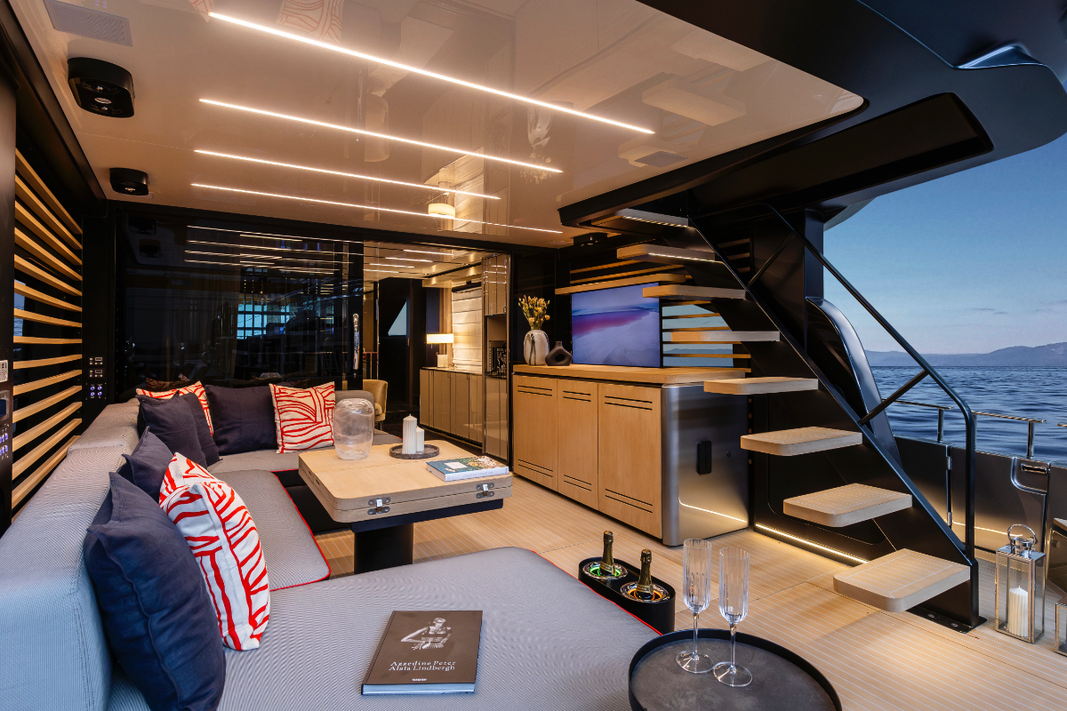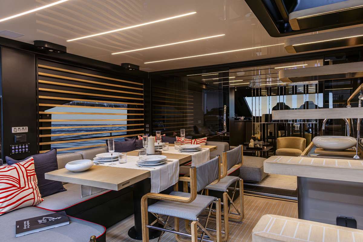 Christian Grande’s design celebrates the seamless connection between interior and exterior. An elegant glass door links the living area to the aft cockpit, while strategic openings, such as the side door and fully retractable windows, allow natural light and the sea breeze to flow gently through, enveloping the space and creating a sense of harmony with the sea.