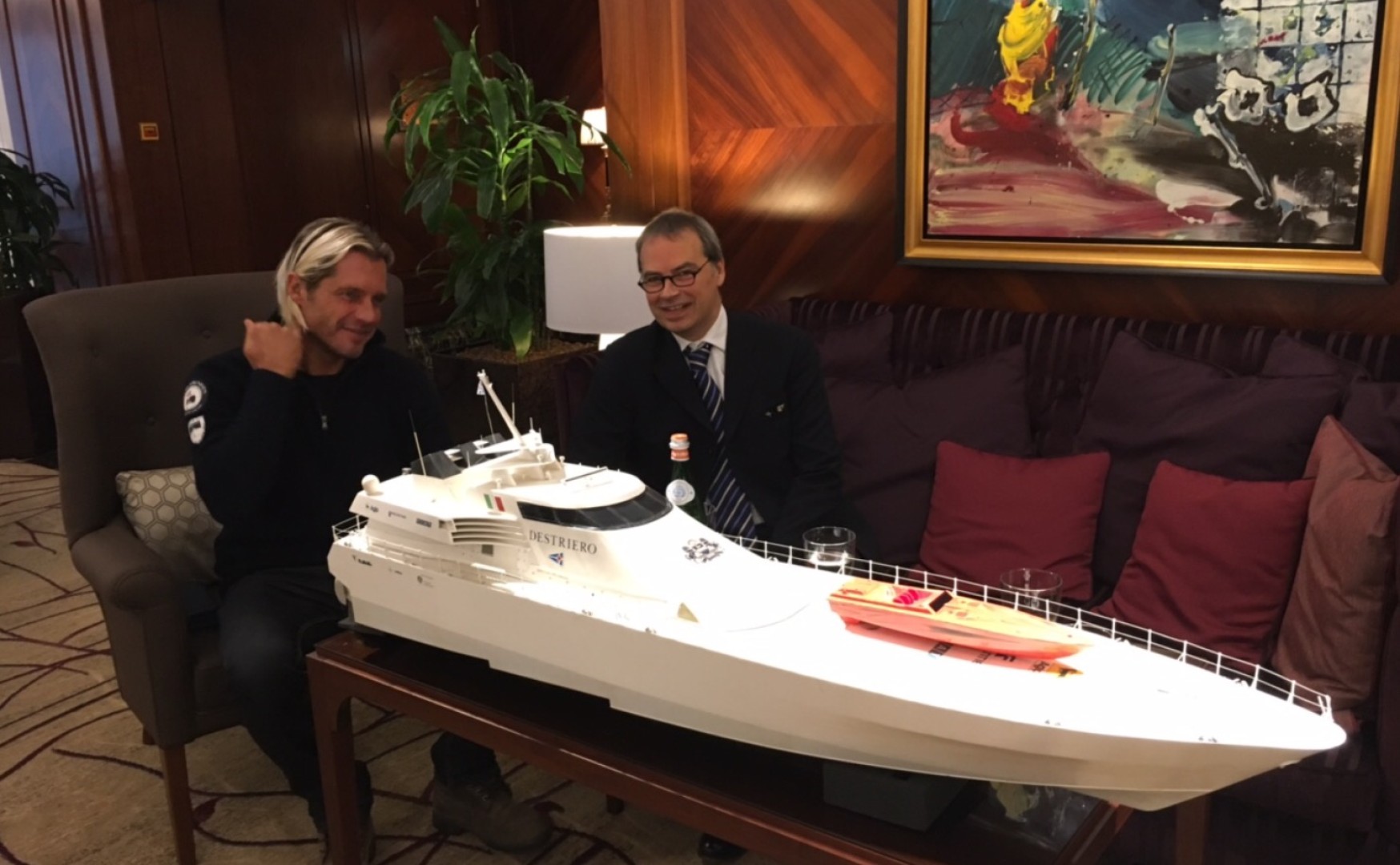 In Dec. 2021 Alberto Scuro, President of Automotoclub Storico Italiano, sent a letter to Aga Khan to request the ship in operational condition as an Italian Technical Monument/Heritage. We, the consortium of international speedboat specialists, highly appreciate Alberto Scuro's initiative and added due to the fact that the also element to success turbines are from German MTU to make an ItalianGerman 30. Birthday event out of it. If Albert Scuro would get Destriero from Aga Khan and additionally in the requested operationable condition we suggested to win with a mixed ItalianGerman crew under one Italian Captain and German Captain Roger Klueh in a 2nd run now finally the legendary Blue Riband between New York and Europe and to hand over the Trophae to Aga Khan for his great Naval Life Work. As Roger Klueh knows already the first part from USA towards Atlantic heading East from his successful USA-Cuba razorblade hellride Speedboat Worldrecord with huge waves and one of the two propulsions broken.
