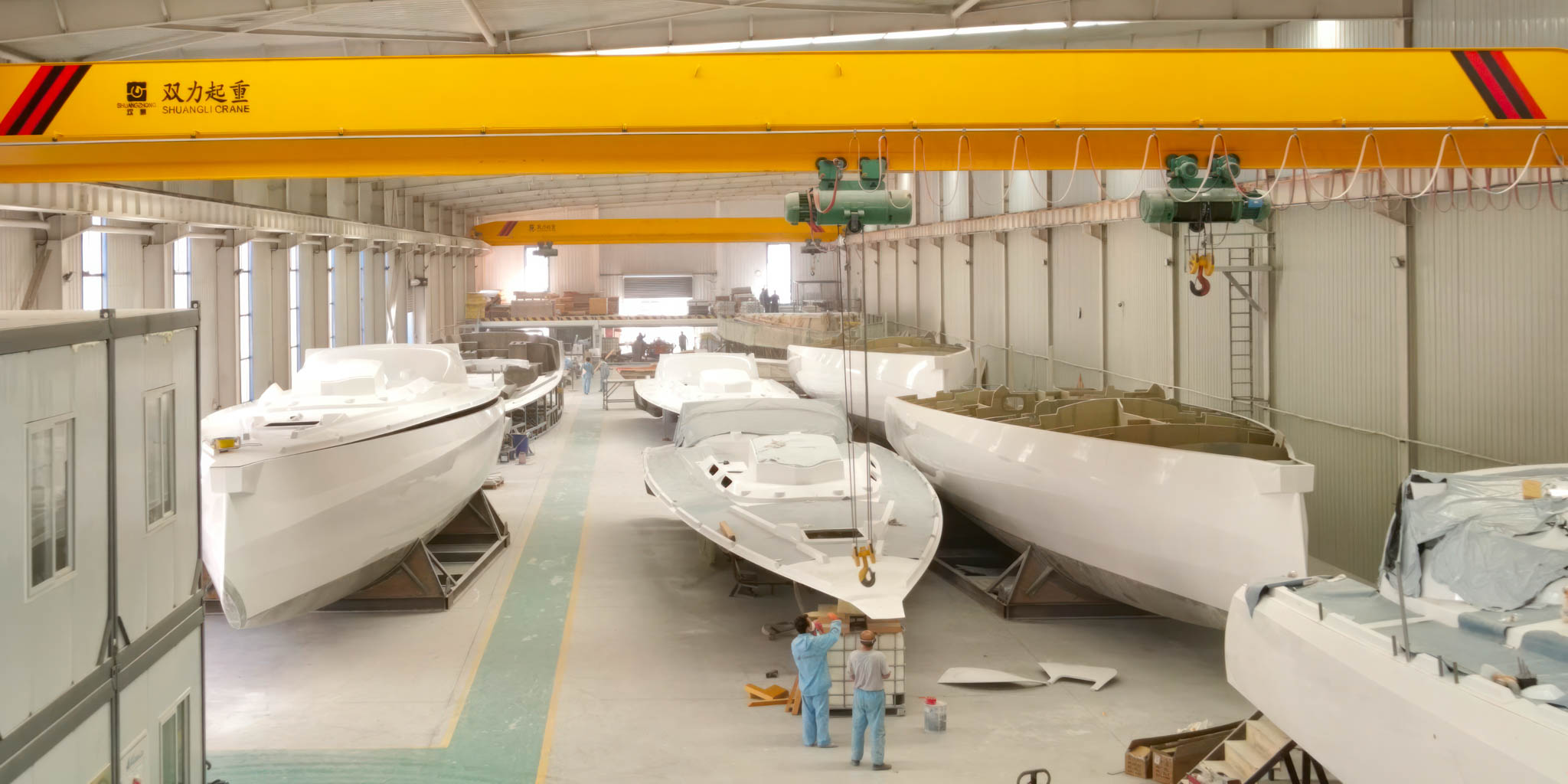 The 12 hulls of the fleet are under construction at a yard in Qingdao, China, using infused vinylester sandwich construction with a foam core. First deliveries are scheduled during 2026. Equipment is sourced from international suppliers: Irons Brothers keels with cast-iron fin and lead–antimony bulb; Antal deck hardware; Hyde Sails; Yanmar propulsion with Whisper generator; onboard systems supplied by LKQ Aquafax; Edson steering systems; Sta-Lok rigging; Marlow ropes; Schenker watermakers; Coppercoat antifouling; and Ocean Safety safety equipment. The mast, supplied by Sparcraft Masts, measures 29.575 metres, with an air draft of approximately 30.5 metres.