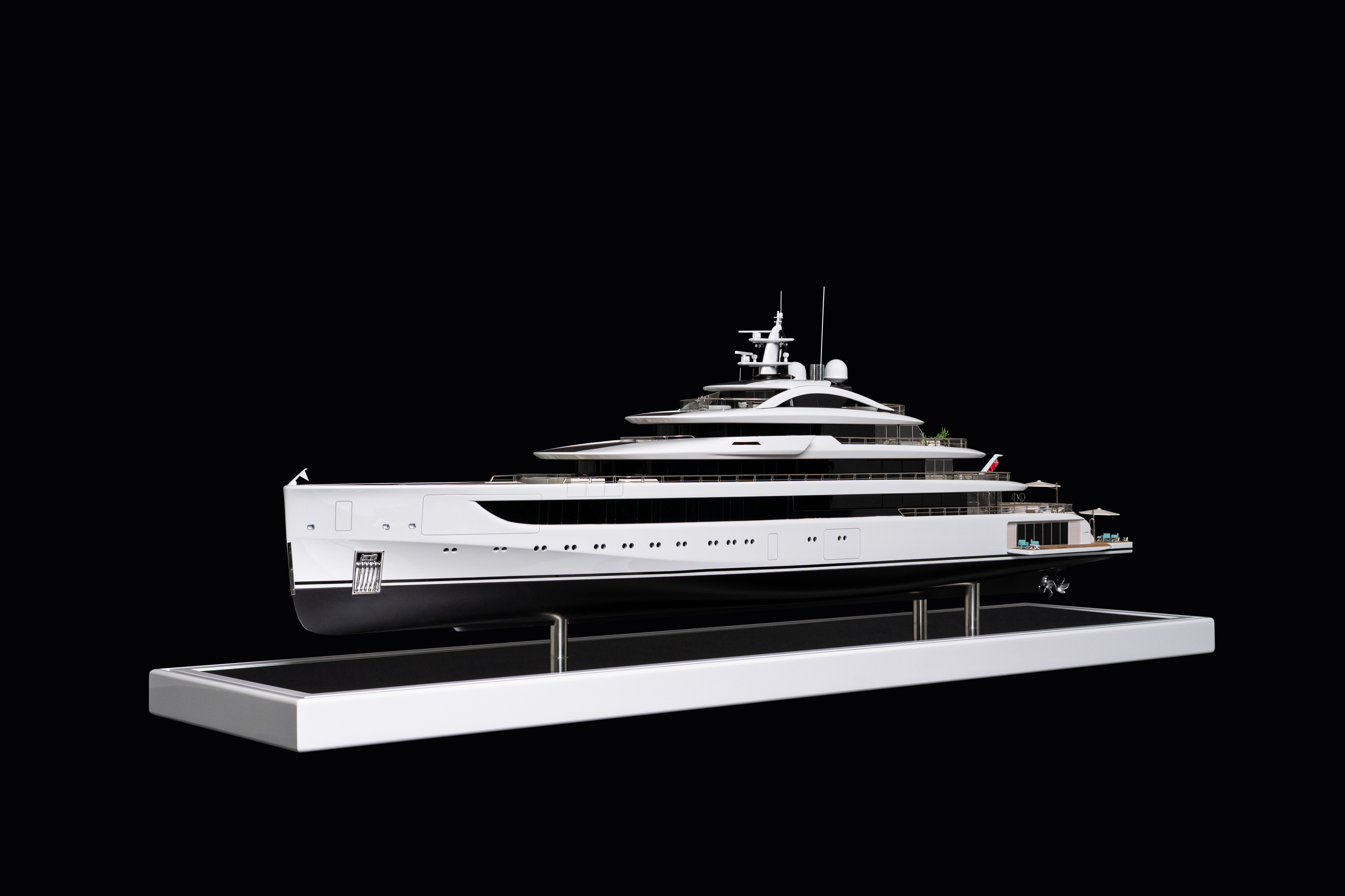 At the large end, the reference is Feadship Ulysses, about four metres. Scale 1:100 on a huge project, designed to transmit its imposing presence at first glance.