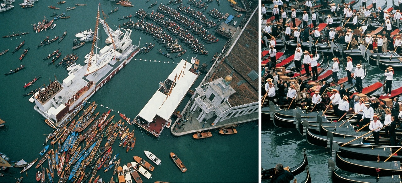 LEFT An aerial shot of the Il Moro di Venezia launch in 1990 that brought the city of Venice to a standstill - note the honour guard of the city’s gondola community.