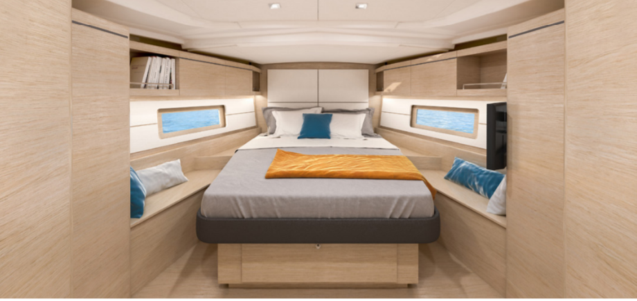 In the three cabin ver-sion, the guest rooms aft of the companionway are the same size and strikingly bright thanks to a large hull porthole and two deck hatches. The generous ceiling height of these cabins allow a layout with bed heads facing in the same direction as the boat.