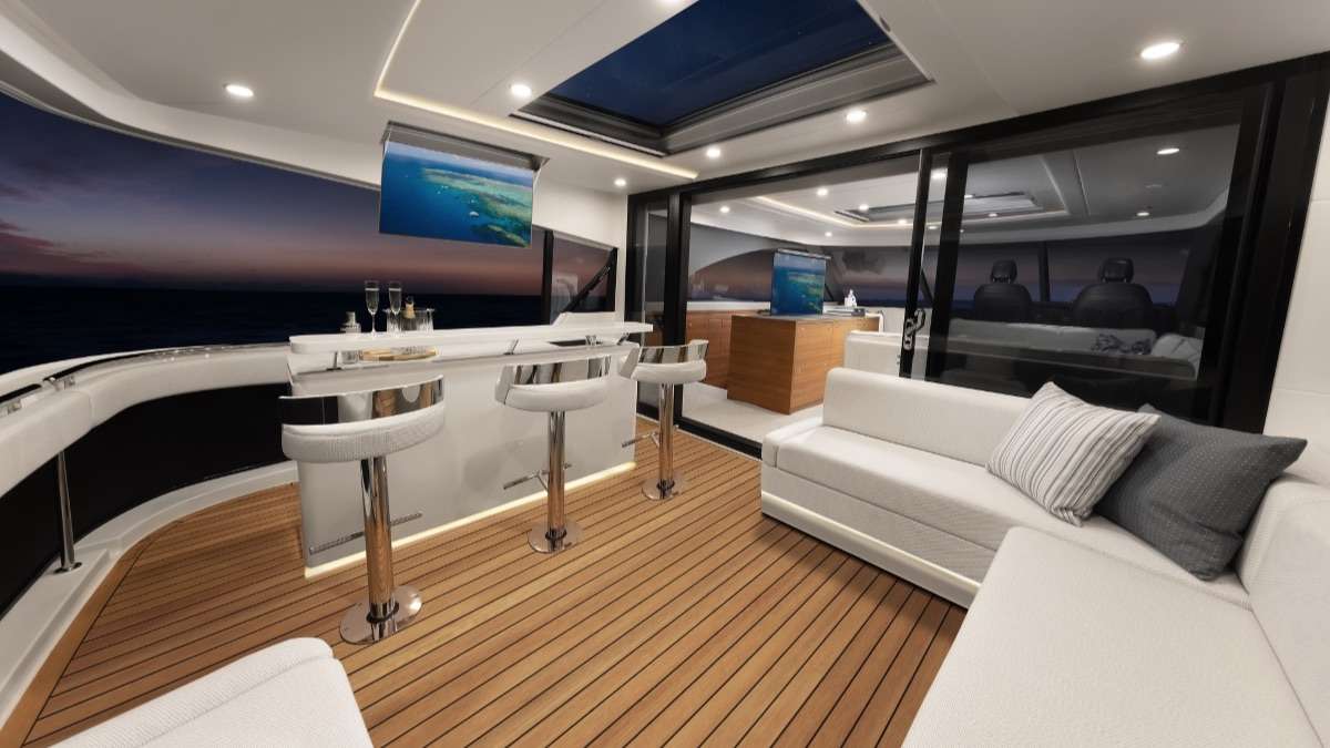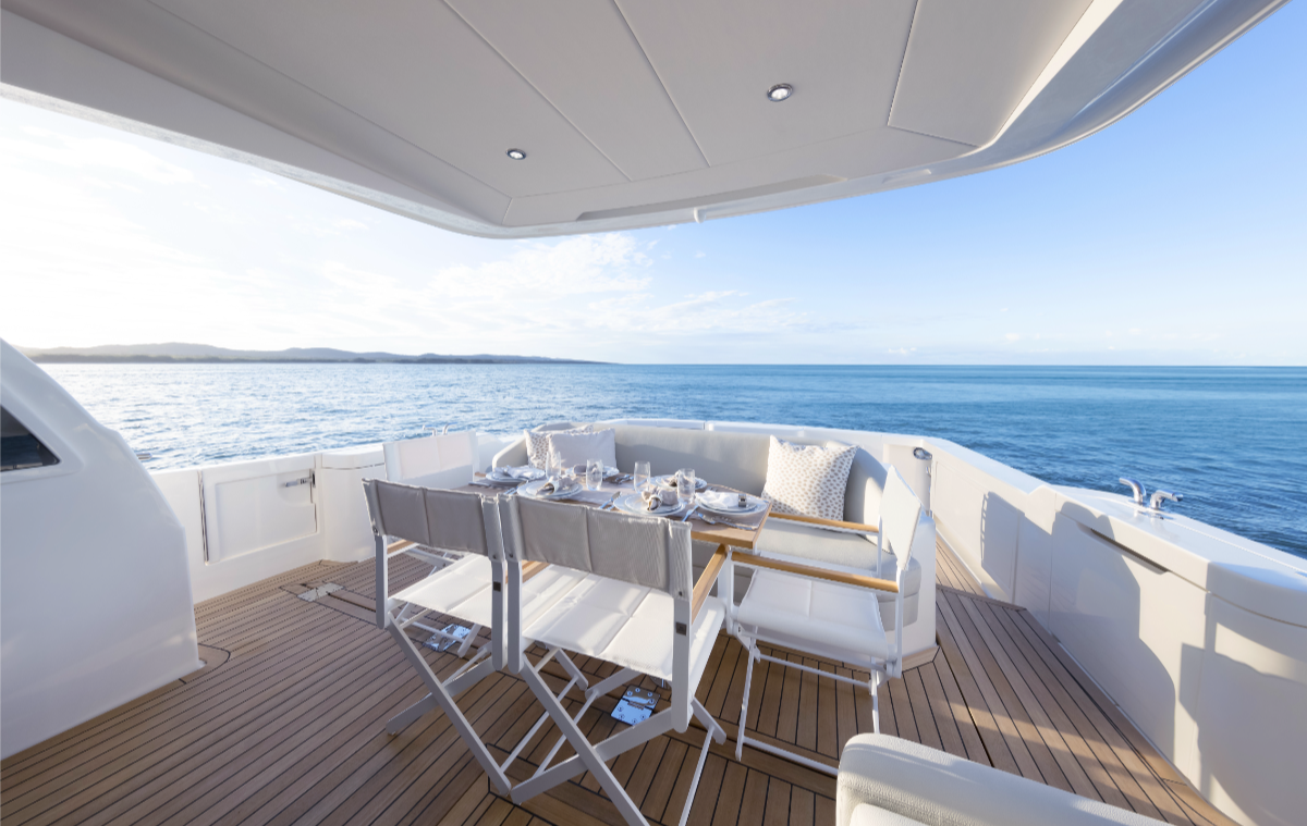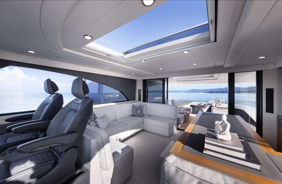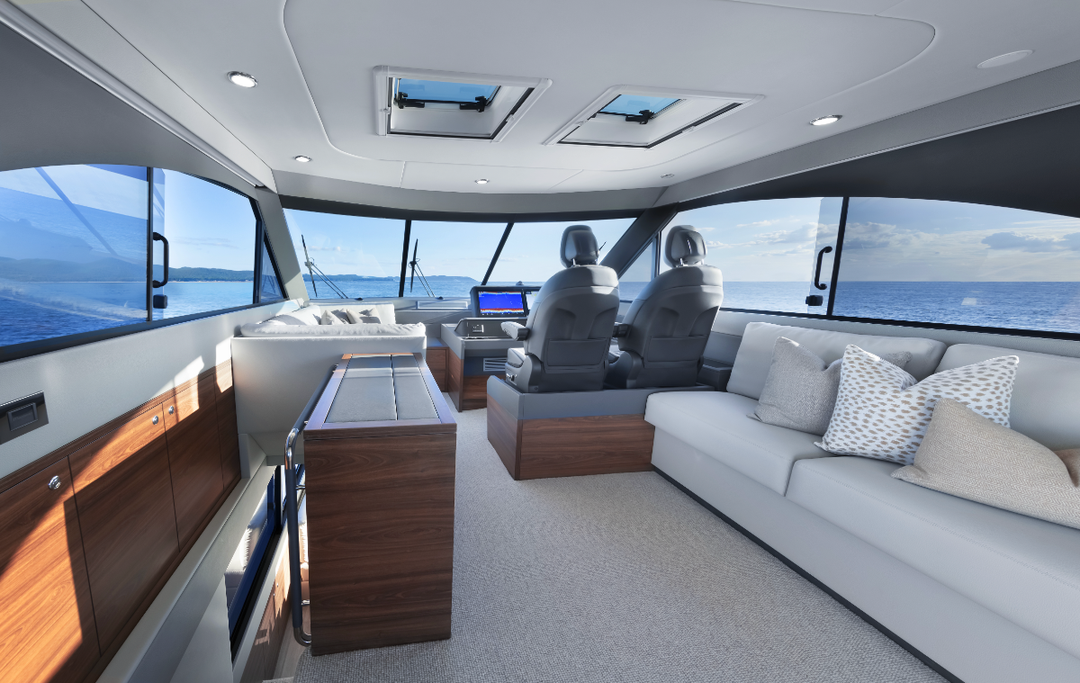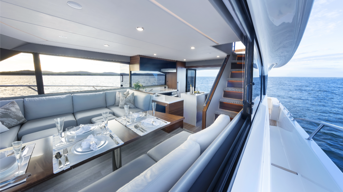 The expanse of deck space within the upper cockpit and adventure deck is as equally impressive, with the upper cockpit also capable of transforming into a protected indoor/outdoor zone via concealed clears or a breezeway hidden away within the overhead headliner.