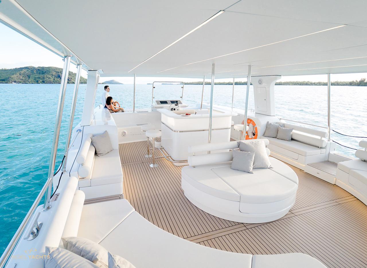 Per accrescere la energia prodotta, che è funzione dell’area ricoperta di pannelli, la tettoia del catamarano è la più ampia possibile e non solo alimenta il motore ma anche tutti i servizi di bordo.