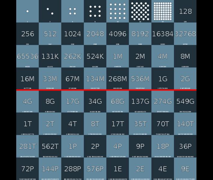 Una vecchia storiella cinese racconta di un saggio che aveva vinto a scacchi con il re e a cui il re aveva chiesto di esprimere un desiderio, che lui avrebbe accontentato. Il saggio chiese un chicco di riso nella prima casella della scacchiera, due chicchi nella seconda, quattro nella terza e cosi via al raddoppio per sessantaquattro caselle: il re accondiscese senza pensarci, sembrava facile. Ma presto scoprì di aver promesso troppo. Sarebbero occorsi 18.400.000.000.000.000.000 granelli, cioè 184 seguìto da 17 zeri: a cinquanta granelli per grammo, 35 seguìto da 16 zeri di grammi, 35 seguìto da 13 zeri di chili, 35 seguìto da 10 zeri di tonnellate, 35 seguìto da 4 zeri di milioni di tonnellate, cioè 350.000 milioni di tonnellate di riso. Considerato che la produzione mondiale annuale di riso è di 700 milioni di tonnellate, per onorare la sua promessa al re sarebbe servita la produzione mondiale per 500 anni.