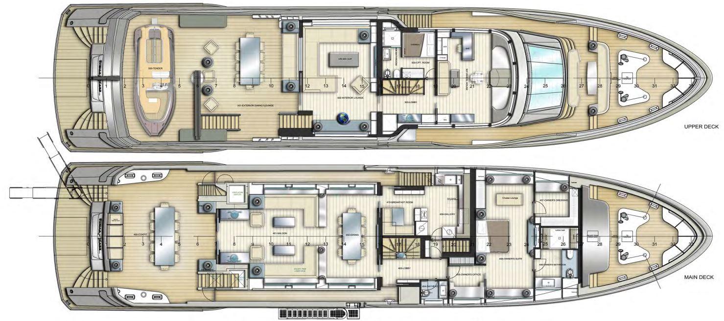 Lo yacht è progettato con un layout a tre ponti chiusi più un enorme sun-deck, riparato da un ampio hardtop sormontato da una piattaforma con visibilità a 360°, progettata per essere un ottimo punto di osservazione durante l’esplorazione. L’ampio flying bridge offre spazio per lettini prendisole, un’area coperta per la palestra, pranzi all’aria aperta con barbecue e frigoriferi e una postazione di governo completa, che è una caratteristica piuttosto rara per uno yacht di queste dimensioni. Il ponte sottocoperta offre uno spazio confortevole per quattro cabine e per l’area equipaggio, con tre cabine doppie, lavanderia e una vera e propria zona pranzo. Sul ponte principale troviamo l’ampio salone, con sala da pranzo, la cucina, l’ingresso principale e la suite armatoriale, dotata di un enorme spazio destinato al bagno e guardaroba. Il ponte superiore fornisce spazio per la zona TV/famiglia, l’ingresso del ponte superiore, l’ampia cabina del comandante e la grande timoneria, con divano e zona ufficio.