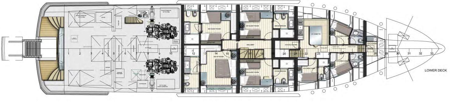 In più, lo yacht ha una capacità di 8.000 litri di acqua dolce e una capacità carburante totale di 75.000 litri, che garantiscono possibilità di navigazione per distanze estremamente lunghe e capacità transatlantiche. I motori principali sono due Caterpillar C32 da 746 kW a 1600 giri/min, che forniscono un’unità di potenza forte e affidabile che permette allo yacht di raggiungere una velocità massima di 14,5 nodi e 10 nodi di crociera. Lo yacht è dotato anche di uno spazioso lazzaretto a poppa della sala macchine che ha un piccolo deposito per i water toys e un banco di lavoro professionale con attrezzi per eseguire qualsiasi piccola riparazione che possa rendersi necessaria durante i lunghi viaggi. L’energia elettrica a bordo è fornita da tre gruppi elettrogeni Caterpillar C4.4 di uguale potenza, per un totale di 252 kW. Una volta che tutti questi elementi sono stati assemblati abbiamo capito che l’obiettivo del “vero explorer” era stato completamente raggiunto e superato.