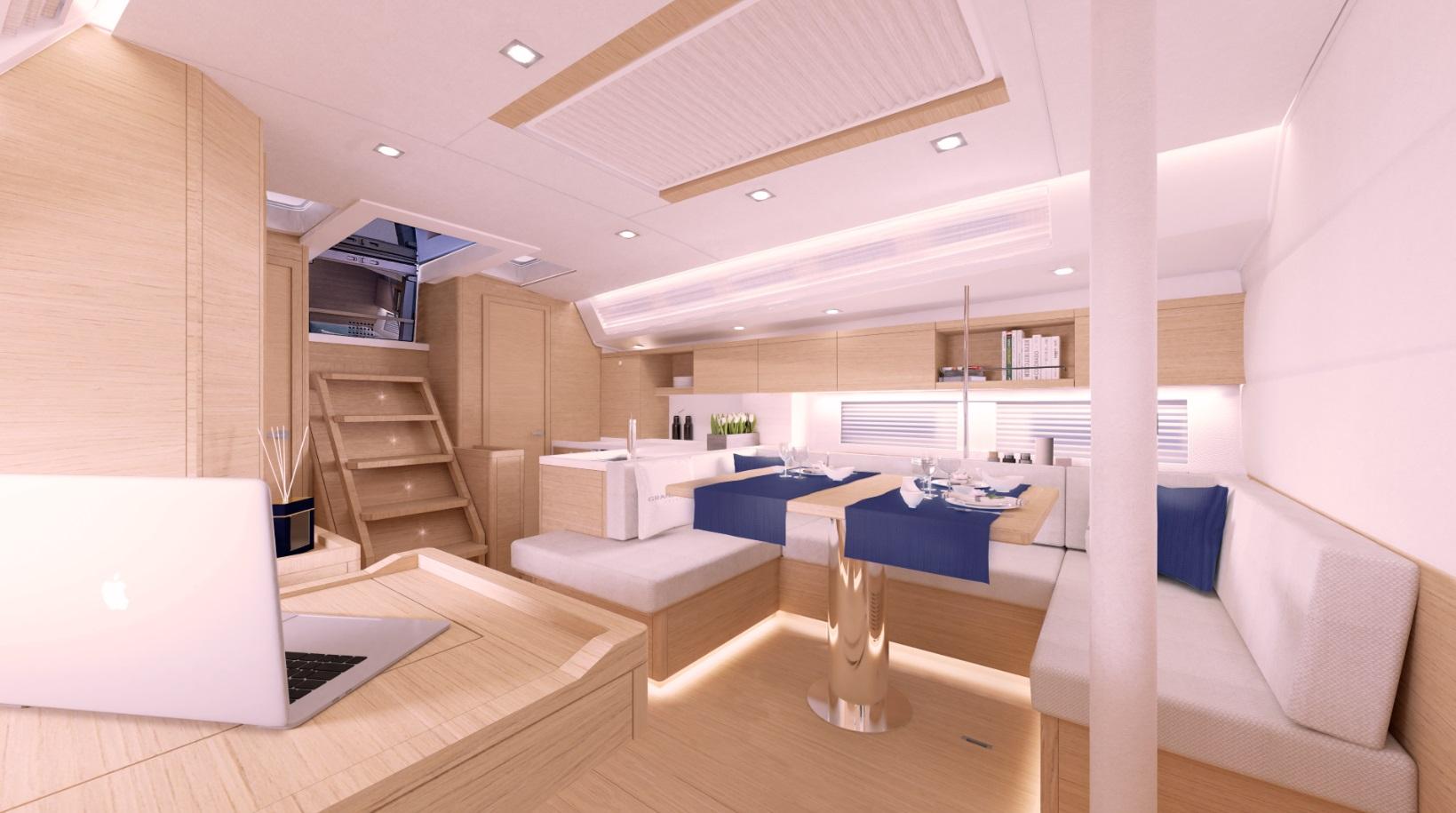 Per quanto riguarda il layout degli interni, saranno disponibili due versioni, una a due e una a tre cabine (entrambe le configurazioni prevedono due bagni con box doccia) per soddisfare il più possibile le esigenze degli armatori. Il salone prevede sulla destra un divano a tre sedute di cui quella centrale può diventare un tavolo da carteggio. La cucina a L è equipaggiata con un capiente frigorifero e un secondo opzionale e ampi spazi per lo stivaggio.