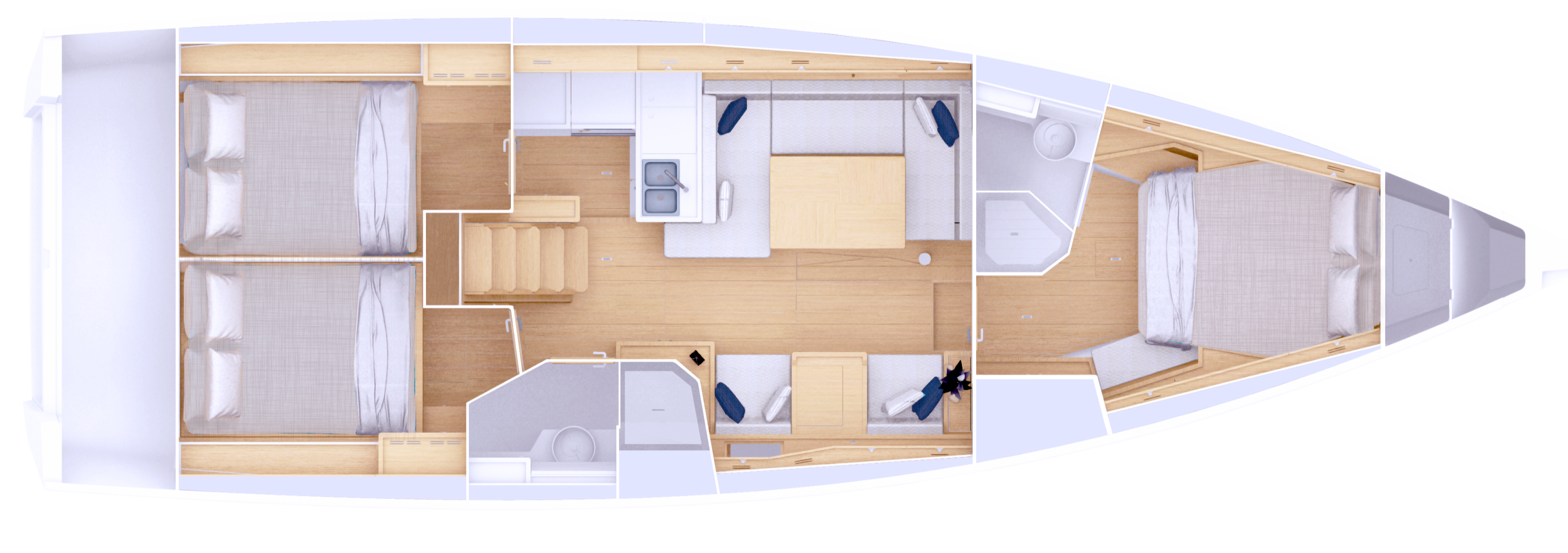 Nella versione a tre cabine è possibile scegliere per la cabina destra di poppa anche l’opzione del letto a V sdoppiato in due letti singoli pensati per avere la testa rivolta verso poppa, mentre la cabina sinistra mantiene il classico layout con letto doppio.