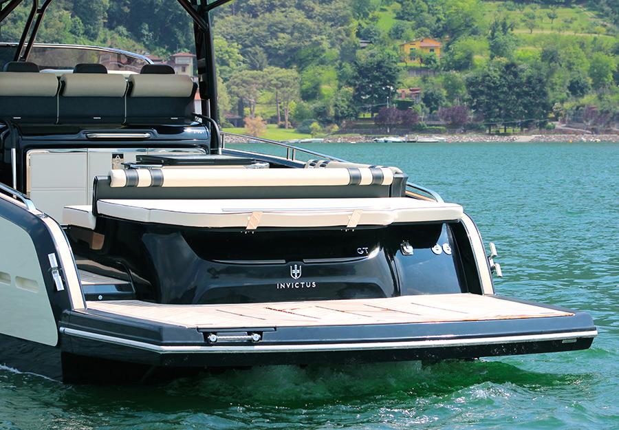 Il pozzetto può essere protetto grazie a un tendalino a scomparsa fornito di serie; tra gli optional dell’Invictus GT 320 spicca poi un hardtop in carbonio che può estendere la proiezione d’ombra tramite un tessuto traforato traspirante tensionato da pali in carbonio.