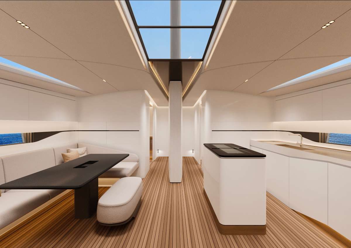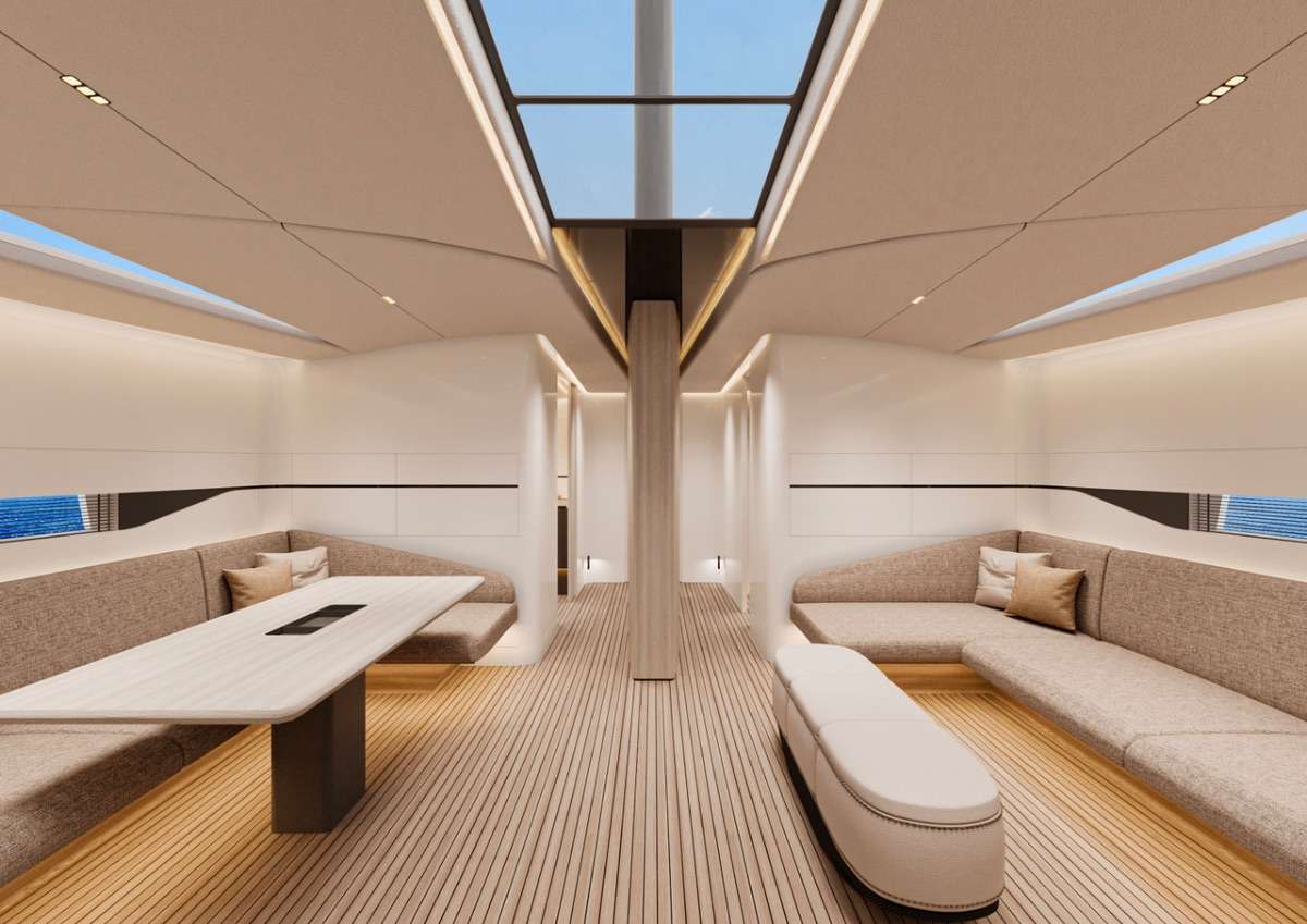 Rispondendo a una precisa richiesta di MYLIUS YACHTS, che voleva incorporareinterni di grande raffinatezza e comfort,nel rispetto del family feeling Mylius, Carkeek ha ricavato spazi e volumi degni di un vero blue water, magistralmente interpretati dallo Studio Parisotto+ Formenton Architetti,sia nel layout che nel decor. La versione proposta prevede tre cabine con bagno privato (master a prua, due ospiti a poppa), unacucina perfettamente attrezzata e un’ampia dinette servita da un day head. A centro barca, separati dalla scassa della chiglia,troviamo un letto pullman a destra e uno studio a sinistra.Le superfici lisce e le linee morbide e tondeggianti, che sembrano seguire i movimenti della barca, conferiscono dinamicità e carattere a questi interni volutamente moderni e sportivi, caratterizzati da un’altissima qualità di materiali e da un’accurata attenzione al dettaglio. In questa fase di costruzione, l’armatore ha la possibilità di modificare il layout, i colori, i materiali e i tessuti a proprio piacimento.