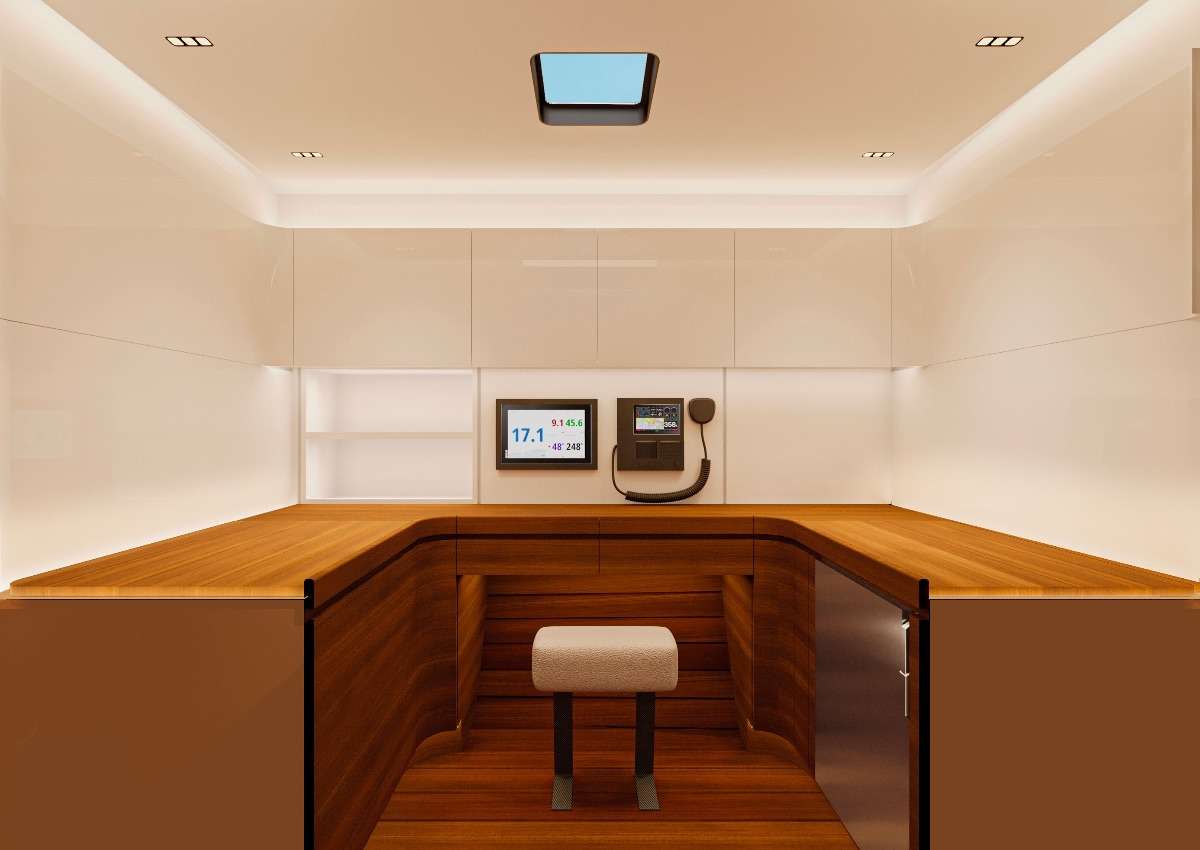 Le manovre sono tutte a scomparsa e i winch (Harken Performance) sono posizionati in modo da non intralciare l’equipaggio. Il pozzetto, protetto da un biminia scomparsa e da eventuale tendalino, prevede due sedute ergonomiche alle quali si può accoppiare un tavolo amovibile. Lo specchio di poppa, infine, può ospitare un tender di generose dimensioni e, in crociera, si trasforma in una comoda spiaggetta per facilitare l’ingressoinacqua.
