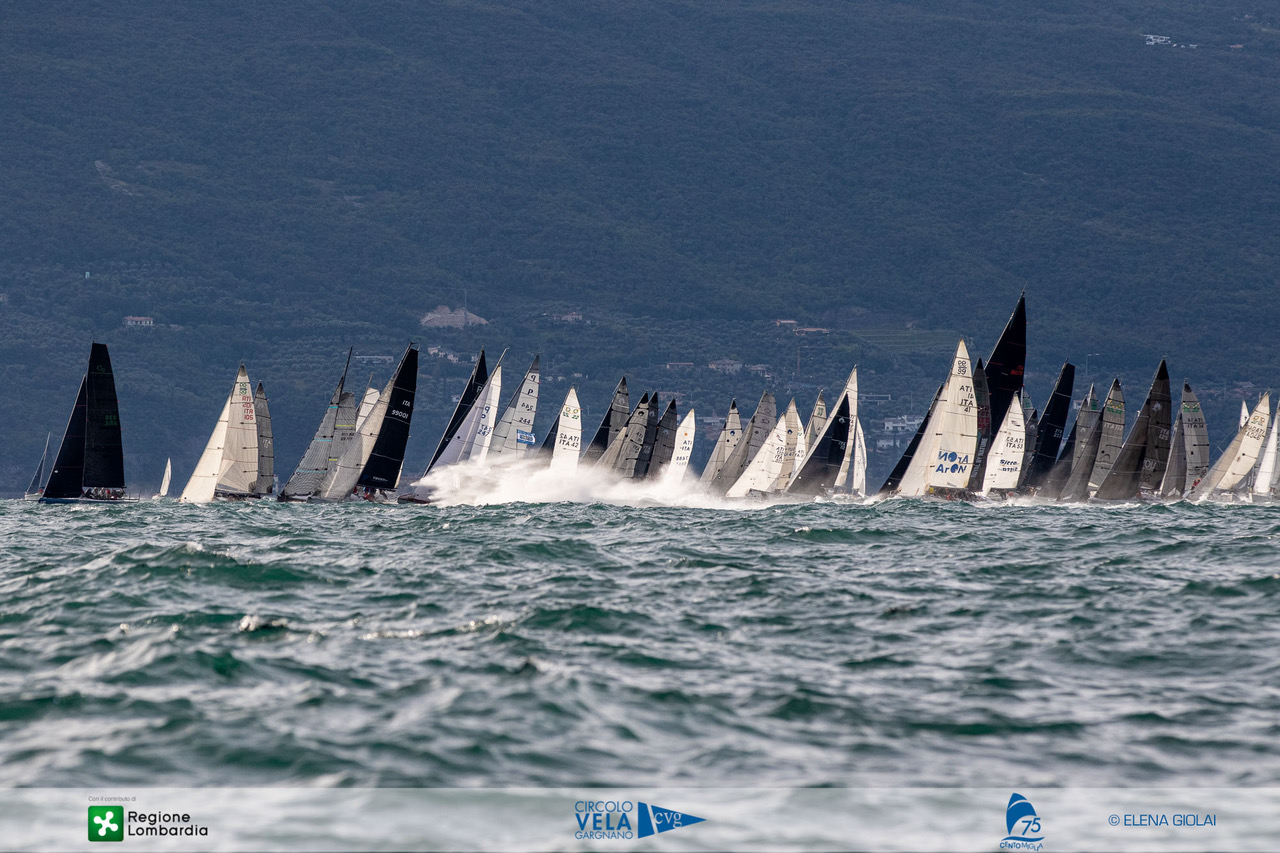 La regata che abbraccia tutto il lago di Garda, con percorso verso nord e passaggi alle boe di Limone, Garda Trentino, Brenzone e ritorno con arrivo a Bogliaco: Lombardia, Trentino e Veneto unite in una grande regata. La partenza è avvenuta puntuale alle 8:30 con vento teso di 18-20 nodi, salito fino a 25 nella prima parte della bolina verso nord. Non sono mancati ritiri eccellenti: il QFX, vincitore del Trofeo Gargnano di sabato, ha rotto il timone poco prima della partenza; uno dei 45er tedeschi ha preferito rientrare per non rischiare danni con vento in crescita; l’ICE 33 Black Arrows del trentino Michele Caldonazzi, protagonista di tante regate gardesane, si è dovuto ritirare per la rottura di una sartia e il conseguente rischio di disalberamento.