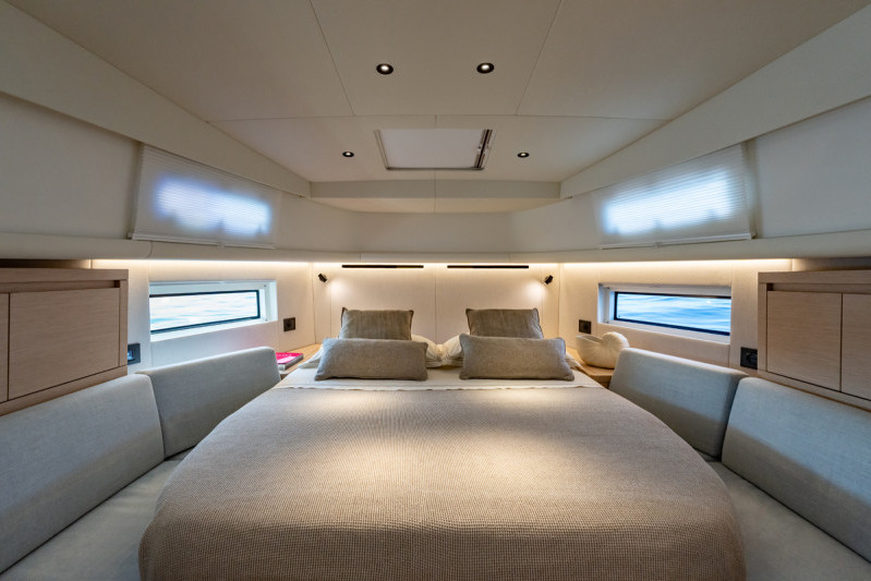 Per la prima volta, gli interni portano la firma di Nauta Design, mentre esterni e architettura navale restano affidati a Zuccheri Yacht Design. Una collaborazione che ha permesso di preservare il DNA del modello introducendo soluzioni più mature nella gestione degli spazi. Sottocoperta, l’ambiente è stato completamente ripensato: la dinette trasformabile rappresenta una delle principali novità, affiancata da cabine più confortevoli, materiali aggiornati, nuove essenze di legno e un’illuminazione studiata per rendere l’atmosfera più accogliente. La cabina di poppa guadagna spazio in larghezza, migliorando sensibilmente la vivibilità.