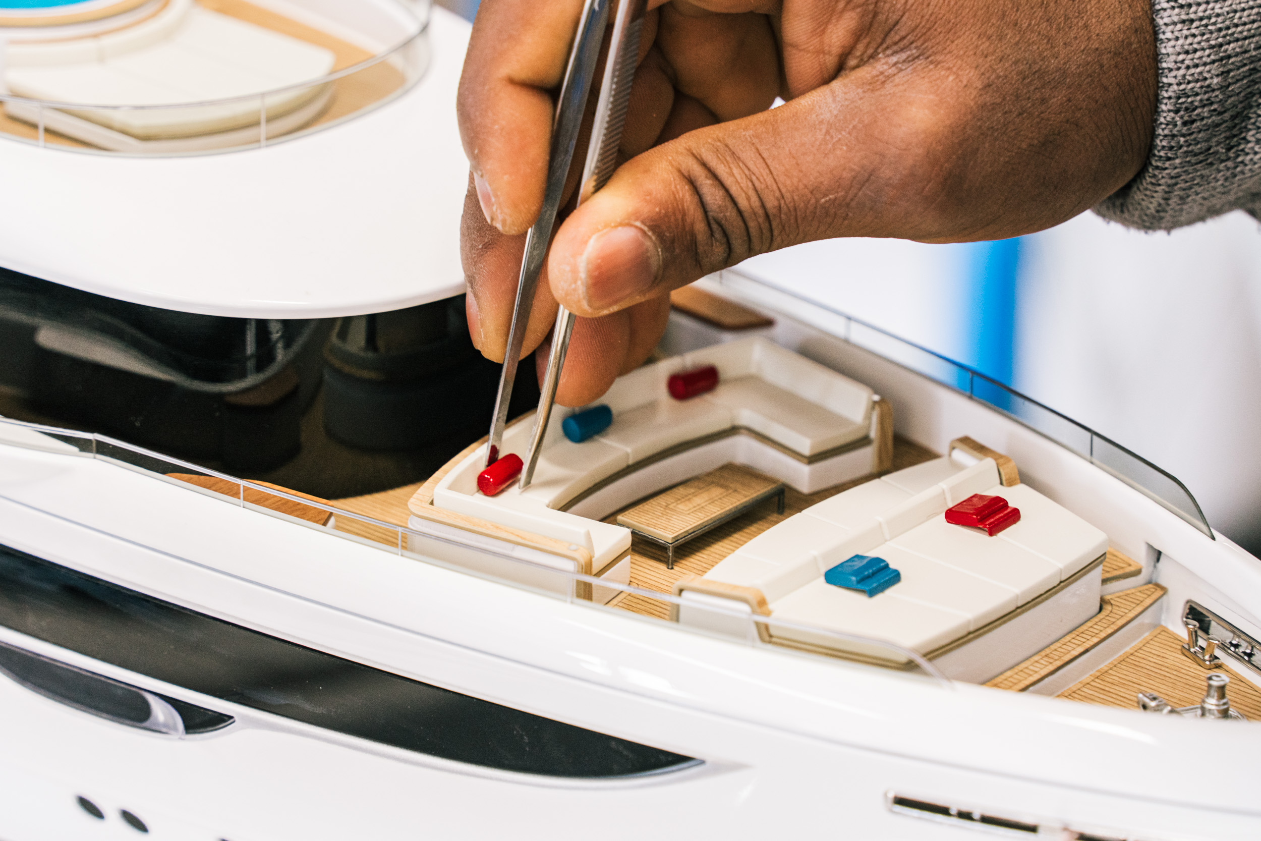 A Monaco, per dire, avevamo oltre 100 modelli: alcuni fermi, altri che giravano tra eventi paralleli (Boat International, Robb Report e altri). Spostare un modello da quattro metri non è “prendere e portare”: è logistica, casse, team addestrato, tempi stretti. E parliamo anche di pesi importanti: tra mobile e modello si arriva a circa 300 kg, spesso con moduli separati.