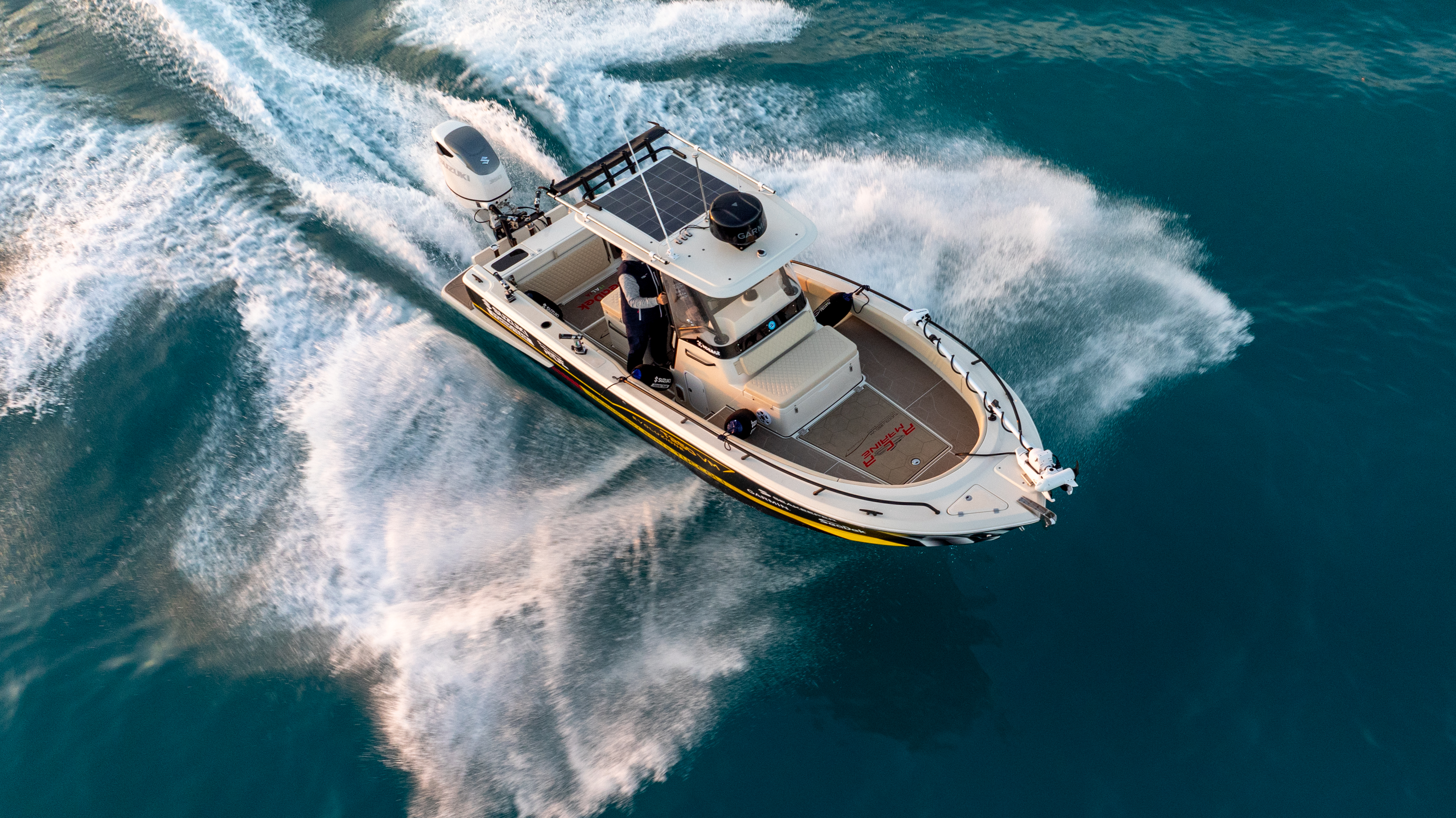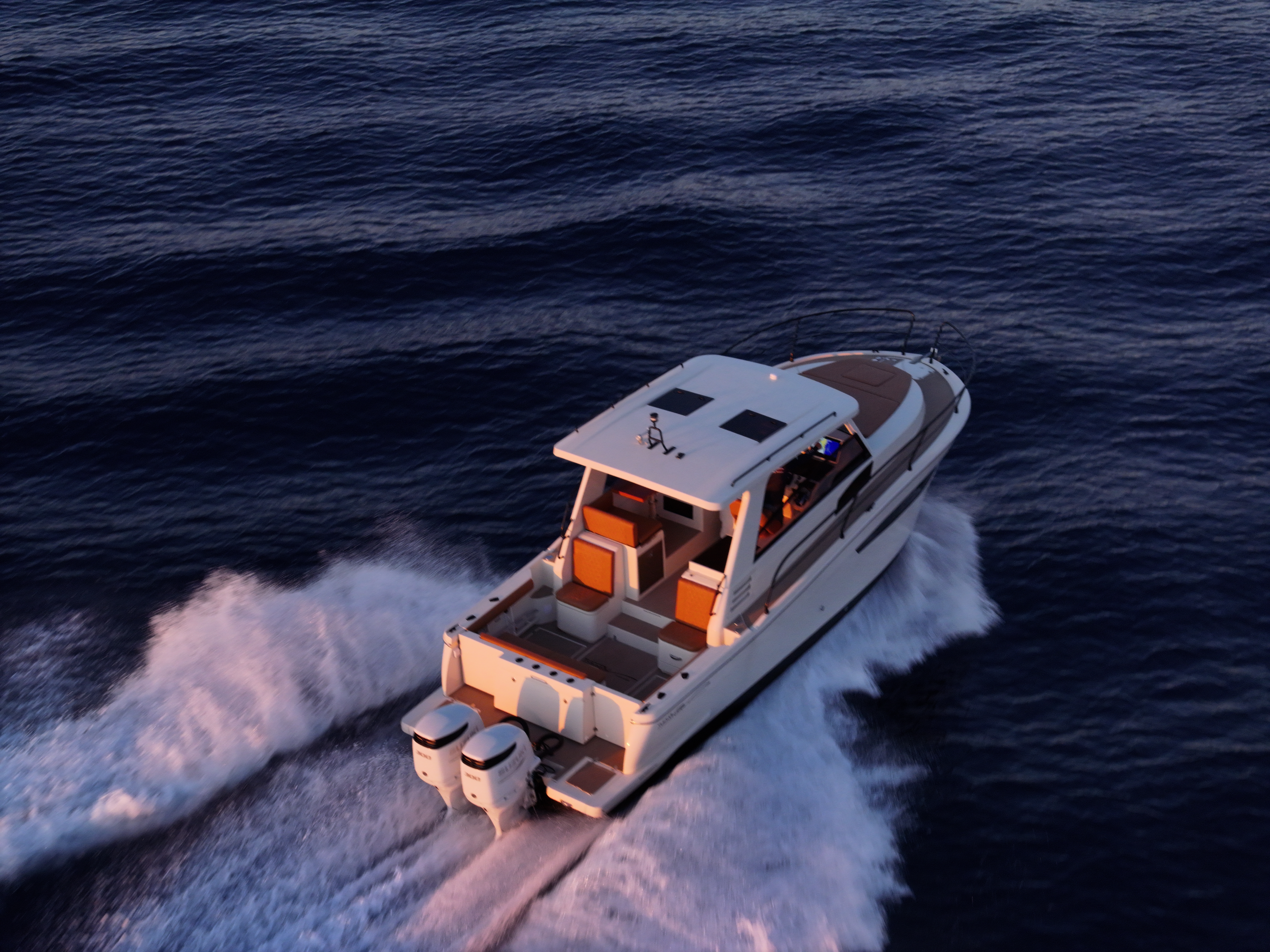 La carena è stata riprogettata integralmente, ottimizzata fin dall'origine per la propulsione fuoribordo. Non è un adattamento, ma un disegno nato per quella soluzione propulsiva. Anche la coperta è completamente nuova, così come gli interni, con una configurazione che consente di avere due cabine reali con altezze interne adeguate e una timoneria completamente chiudibile.