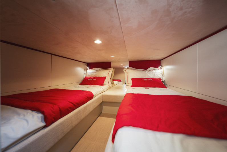 “Il richiamo ai colori della mia Ferrari LMGT3 Evo – ha dichiarato Francesco Castellacci - lo rende ancora più personale, come un filo diretto tra pista e mare.” La versione PISTA, infatti, si distingue per una livrea metallizzata argento e rosso, ponte in teak e una serie di dettagli in fibra di carbonio che richiamano il mondo delle auto ad alte prestazioni. L’ispirazione automotive si riflette anche nella configurazione della plancia e nelle sedute, caratterizzate da motivi personalizzati derivati dall’estetica delle vetture sportive.