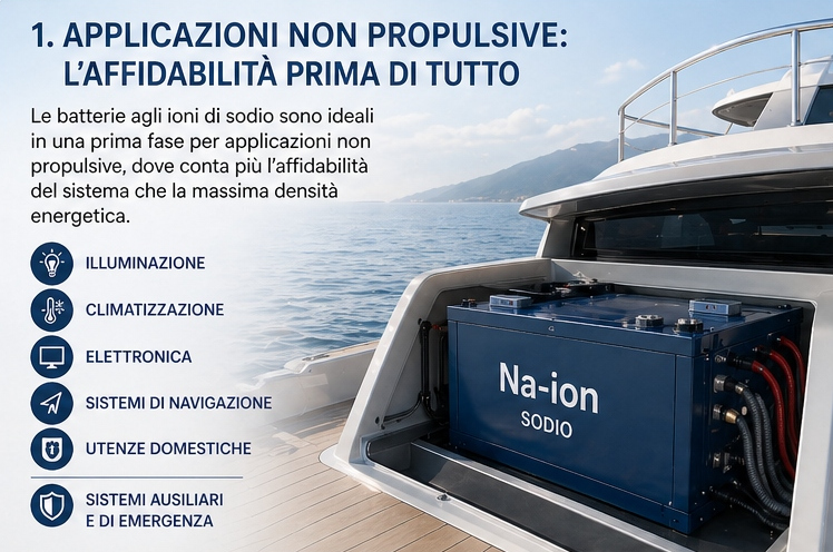 Nel contesto nautico, le batterie agli ioni di sodio si prestano in una prima fase soprattutto ad applicazioni non propulsive, dove il fattore determinante non è la massima densità energetica ma l’affidabilità del sistema. In particolare, possono trovare impiego nei servizi di bordo (hotel load) - quindi illuminazione, climatizzazione, elettronica, sistemi di navigazione e utenze domestiche - oltre che nei sistemi ausiliari e di emergenza. In queste configurazioni, il maggiore ingombro rispetto al litio è meno penalizzante, mentre diventano centrali altri parametri: la lunga vita ciclica, che riduce la frequenza di sostituzione; la maggiore stabilità chimica, che semplifica la gestione della sicurezza a bordo; e il costo inferiore, soprattutto su installazioni di capacità medio-alta.