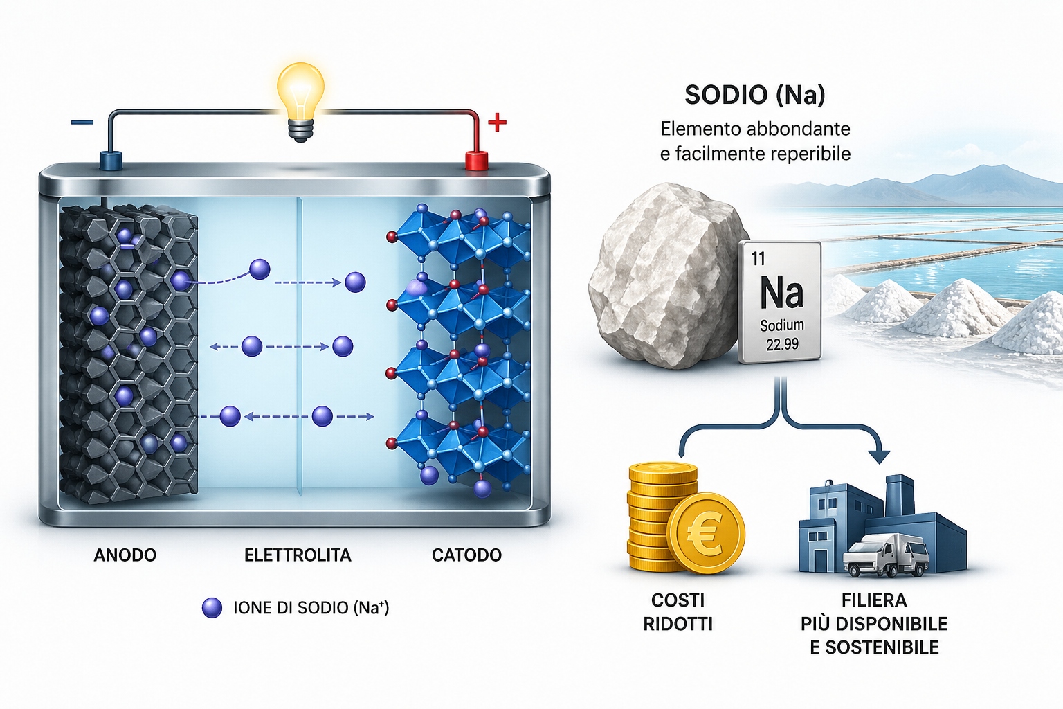 Dal punto di vista tecnico, le batterie agli ioni di sodio funzionano secondo lo stesso principio delle batterie al litio: gli ioni si spostano tra anodo e catodo attraverso un elettrolita. La differenza è nel materiale attivo, il sodio, elemento abbondante e facilmente reperibile, con implicazioni dirette su costi e disponibilità della filiera.