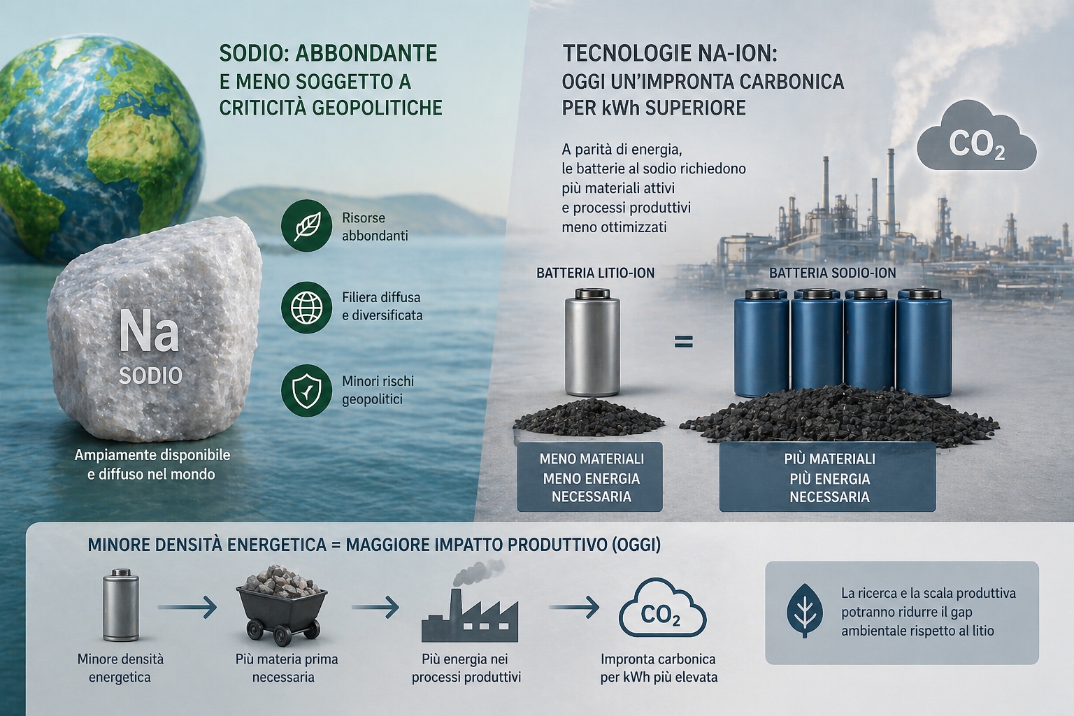 Dal punto di vista ambientale, il sodio presenta il vantaggio di essere ampiamente disponibile e meno soggetto a criticità geopolitiche rispetto al litio. Tuttavia, le tecnologie produttive delle celle Na-ion possono presentare, allo stato dell’arte, un’impronta carbonica per kWh immagazzinato superiore rispetto al litio. Questo dipende dal fatto che, a parità di energia, le batterie al sodio richiedono una maggiore quantità di materiali attivi e processi produttivi ancora non completamente ottimizzati su scala industriale. In altri termini, la minore densità energetica si traduce oggi in più materia e più energia necessaria per produrre la stessa capacità.