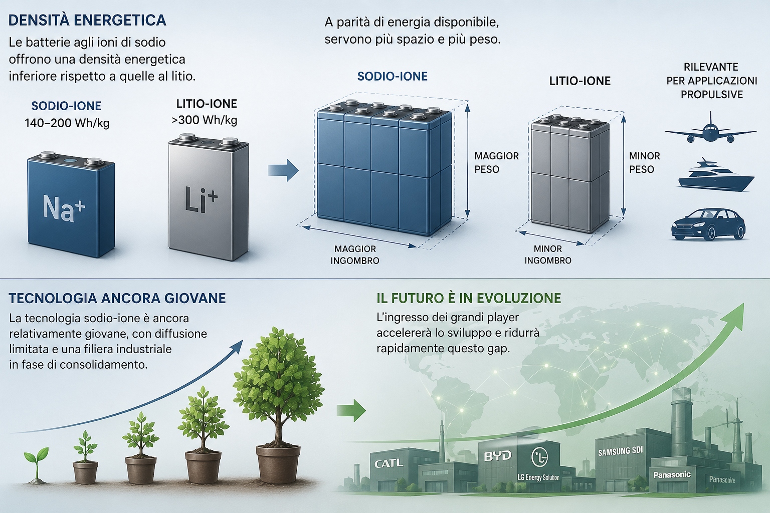 Per la propulsione elettrica pura o ibrida su unità di maggiori dimensioni, il litio mantiene al momento un vantaggio competitivo, ma l’evoluzione delle Na-ion, spinta dagli investimenti del settore automotive, potrebbe ridurre progressivamente questo divario.