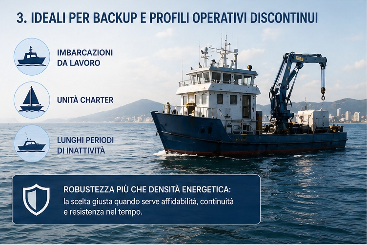 Analogamente, possono essere interessanti per sistemi di backup o per unità con profili operativi discontinui, dove è richiesta robustezza più che elevata densità energetica, come imbarcazioni da lavoro, unità charter o barche con lunghi periodi di inattività.