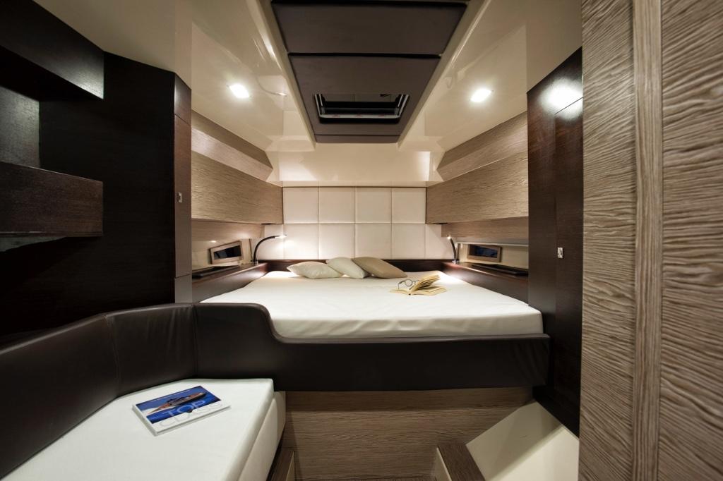 Il ponte inferiore è caratterizzato da un’altezza senza precedenti nella categoria e da un’incredibile armonia cromatica tra la luce del legno di Rovere e il colore scuro del Wengè, realizzando un ambiente incredibilmente raffinato. A poppa, un grande letto queen size accoglie gli ospiti nell’elegante e funzionale cabina armatoriale, estremamente confortevole grazie alle tonalità cromatiche e agli straordinari volumi.