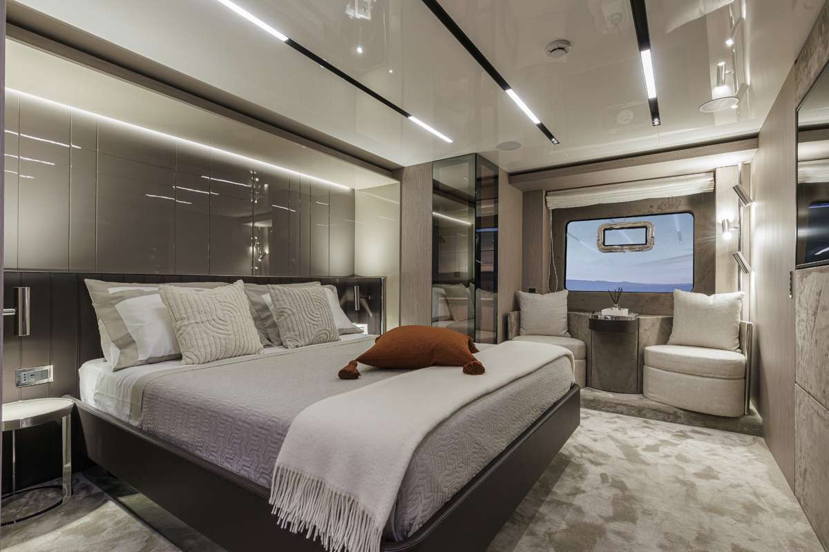 Al ponte inferiore, la suite armatoriale full-beam è un capolavoro di ampiezza e design,caratterizzatada un bagno a murata impreziosito da vetri fumé che amplificano la sensazione di continuità e spazio. In questo modo si abbattono le barriere visive, pur mantenendo la privacy in ambienti come la zona toilette. Una scelta che racchiude quasi un linguaggio intrinseco, capace di trasformare questo ambiente in un rifugio di totale libertà e senza inibizioni.
